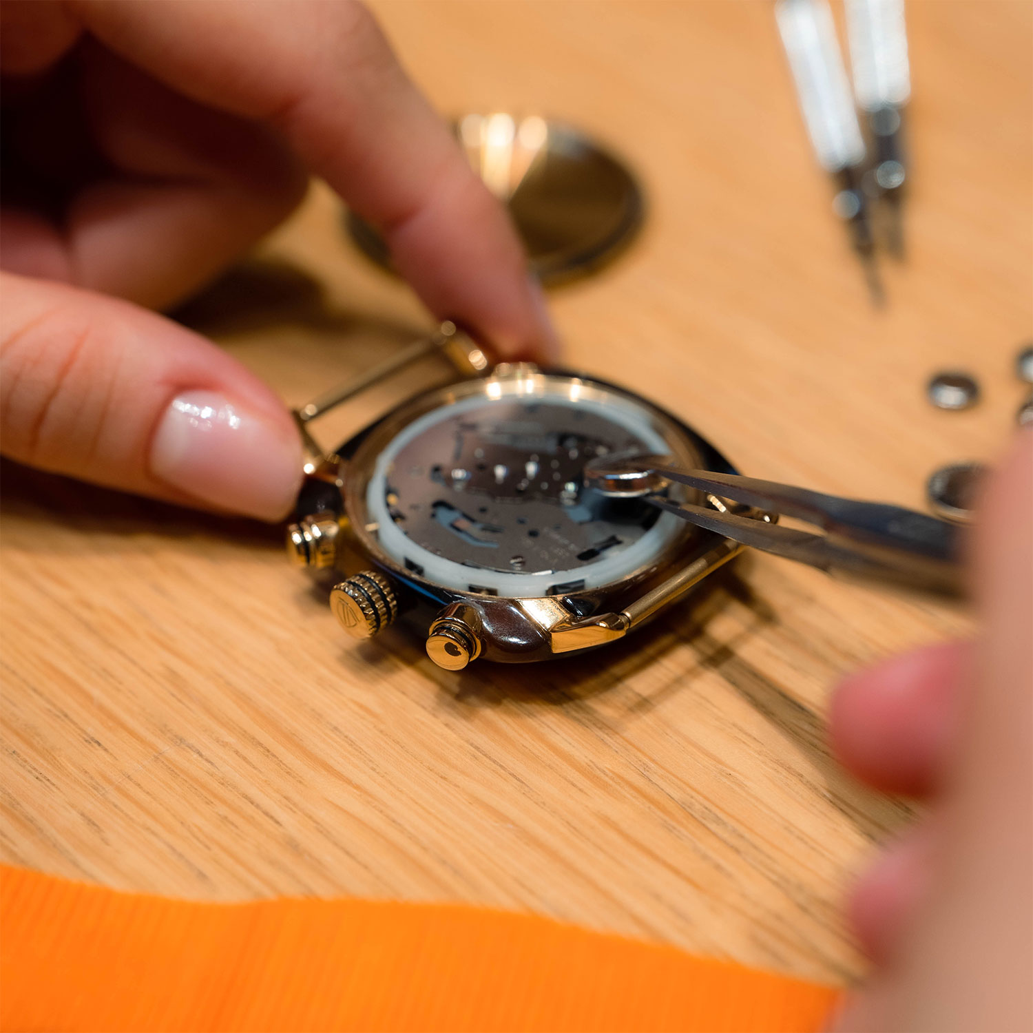 L'Atelier Horloger du Bon Marché Rive Gauche est un service complet, qui propose plusieurs prestations pour réparer vos montres. Les maîtres horlogers de l'atelier effectuent des interventions variées, de la simple révision à la restauration globale en passant par le changement de pile, la révision de l’étanchéité ou la mise à taille du bracelet. L'objectif ? Donner un nouveau souffle à vos objets précieux. Rendez-vous au rez-de-chaussée à l'Espace Horlogerie Joaillerie.