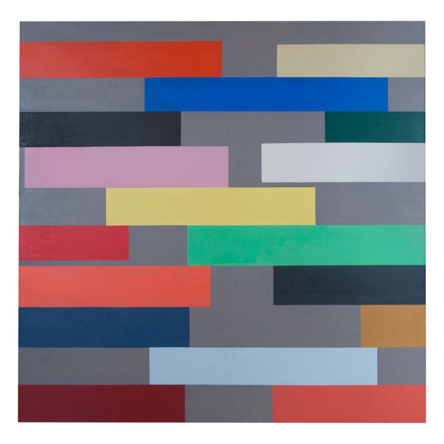 Sylvie Fajfrowska est diplômée de l’École nationale des Beaux-Arts de Paris, ville dans laquelle elle vit et travaille aujourd’hui. Sans titre, se compose d’une dizaine de bandes colorées proches de l’abstraction géométrique des années 1910. Son travail se concentre sur la rencontre d’une forme avec un autre, la vibration produite par cette opposition de motifs géométriques offre une impression d’équilibre précaire où la couleur semble prendre vie.