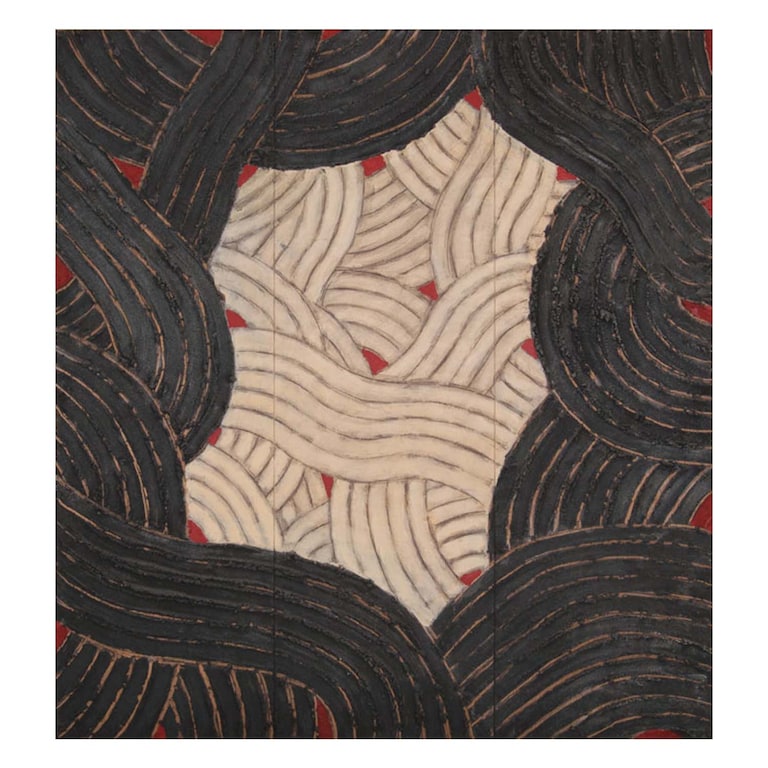 Harold Jacobs développe une œuvre éclectique qui trouve son unité dans une expérimentation constante. Chinese Curtains, est composée de trois panneaux assemblés verticalement où se chevauchent de larges méandres sinueux noirs et blancs sur un fond rouge vif. L’artiste explique « donner de la noblesse aux formes archétypales et aux matériaux pauvres ». L’œuvre aborde l’union harmonieuse des contraires proche de la pensée chinoise et en particulier du taoïsme.