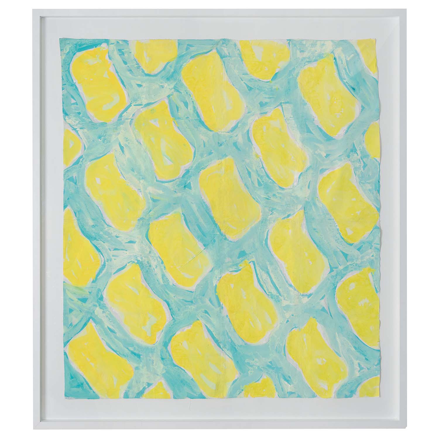 En 1966 Claude Viallat créé sa « forme quelconque » identifiée comme un osselet, un haricot ou une empreinte d’éponge. Il l’applique à intervalles réguliers entre la forme et la contreforme, sur des toiles sans châssis : bâches, draps, toiles de parasols… En 1969, il fonde le mouvement « Supports/Surfaces ». Sans titre n°34, est caractéristique de la radicalité du geste de l’artiste où la matière et son le motif rencontrent la brutalité du tissu devenu support de l’œuvre.