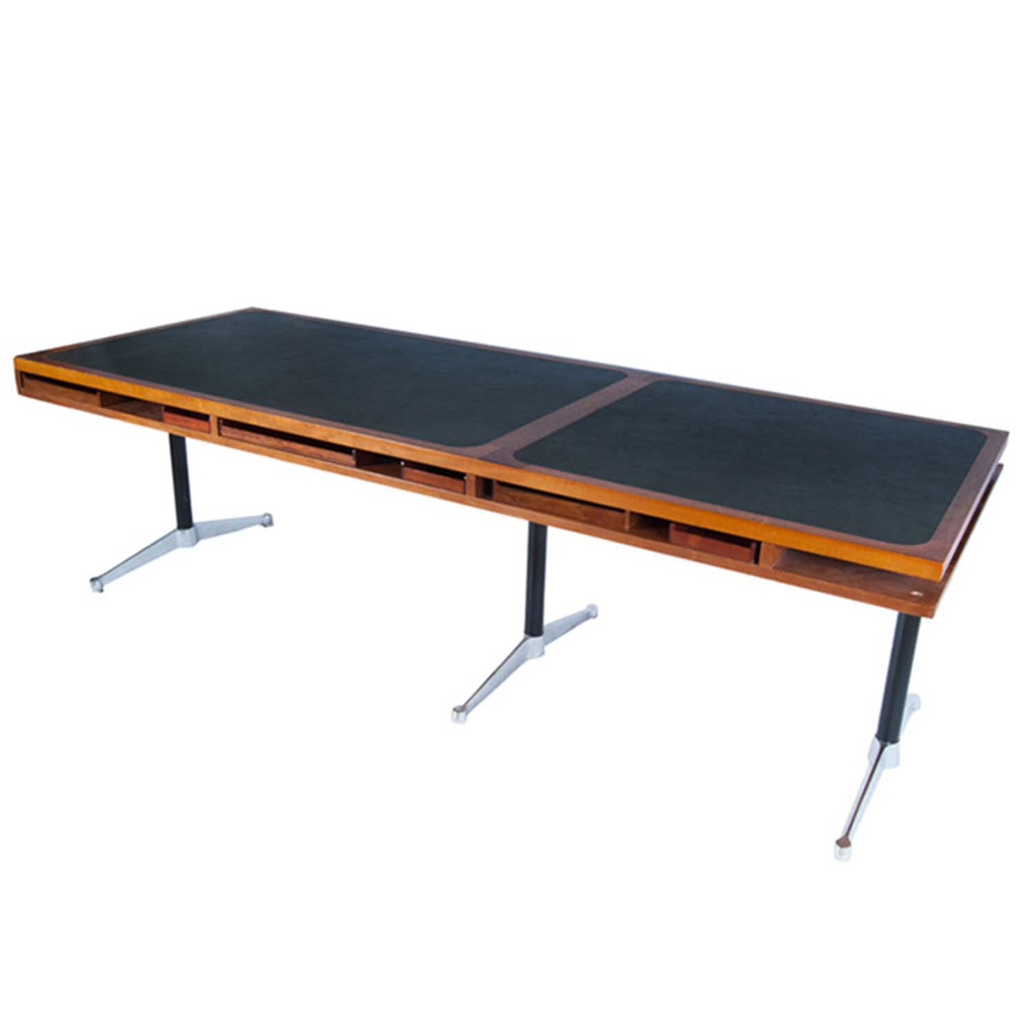 Le couple de designers américains Charles et Ray Eames allient l'utilitaire à l'agréable et créent des unités de rangement compactes, bureaux, sièges de stade, d'aéroport ou d'école. Ils recherchent des formes simples qui deviendront iconiques tel que le piétement en aluminium de cette table. D’inspiration moderniste, cette table de conférence se démarque par son fonctionnalisme et des lignes claires. Son double plateau permet le rangement d’ouvrages et de tiroirs. Il est gainé d’un cuir vert anglais qui réhausse l’essence du bois. Cette table a été pensée pour la bibliothèque de l’Université de Stuttgart en association avec Herman Miller et la société Vitra.