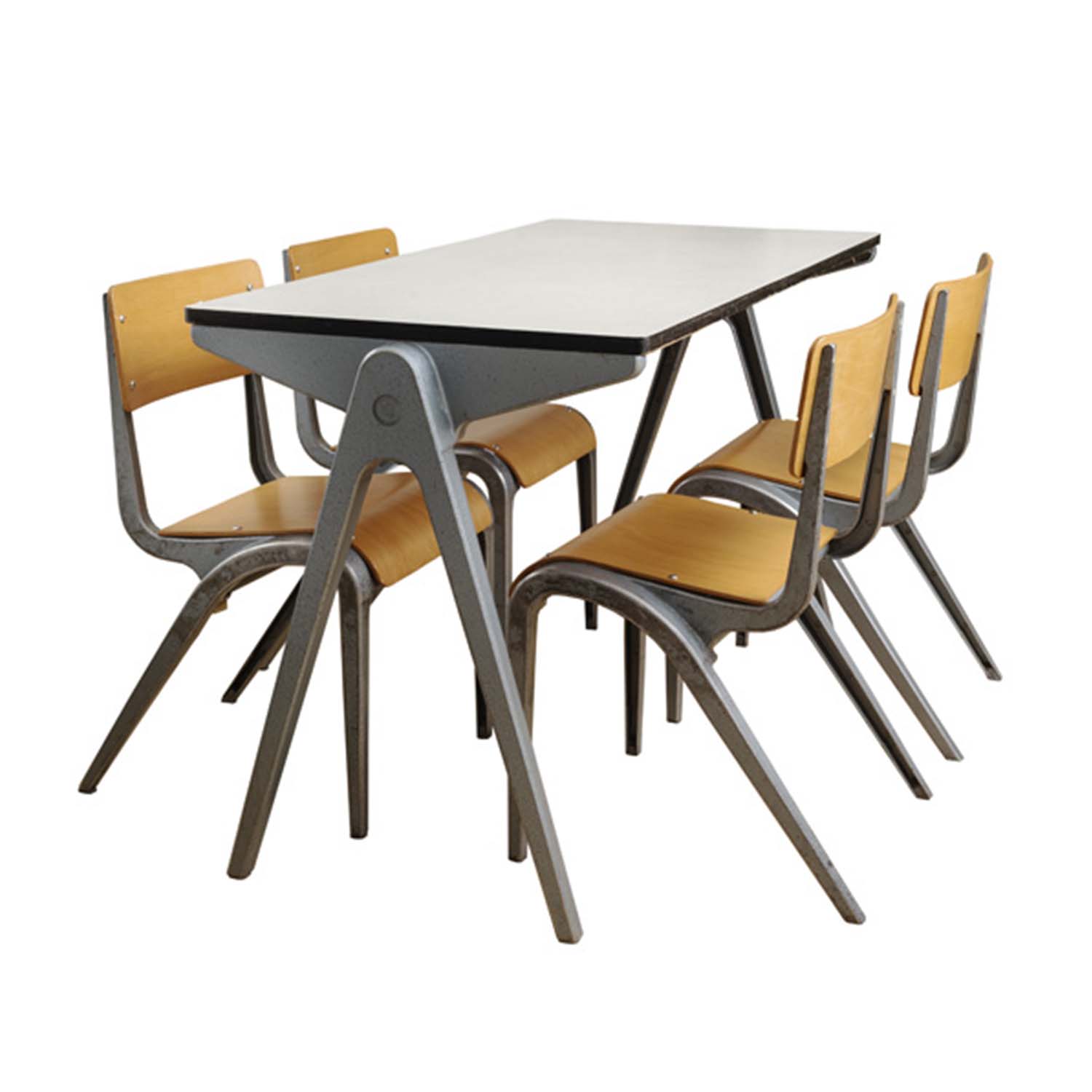 James W. Leonard travaille pour le fabricant Esavian qui fournit du mobilier et accessoires scolaires à bas coût en Europe. Inspiré par le design scandinave, il imagine ces chaises en 1947 et invente un piétement en forme de compas utilisant de l’aluminium moulé issu des armes déclassées après la Seconde Guerre mondiale. Ce pied au design singulier, pensé trois ans avant Jean Prouvé, est une innovation rendue possible grâce à une machine de production américaine agissant sous haute pression. En 1966, la fabrication de ce mobilier cesse, plus d’un million d’exemplaires auront été alors vendus.