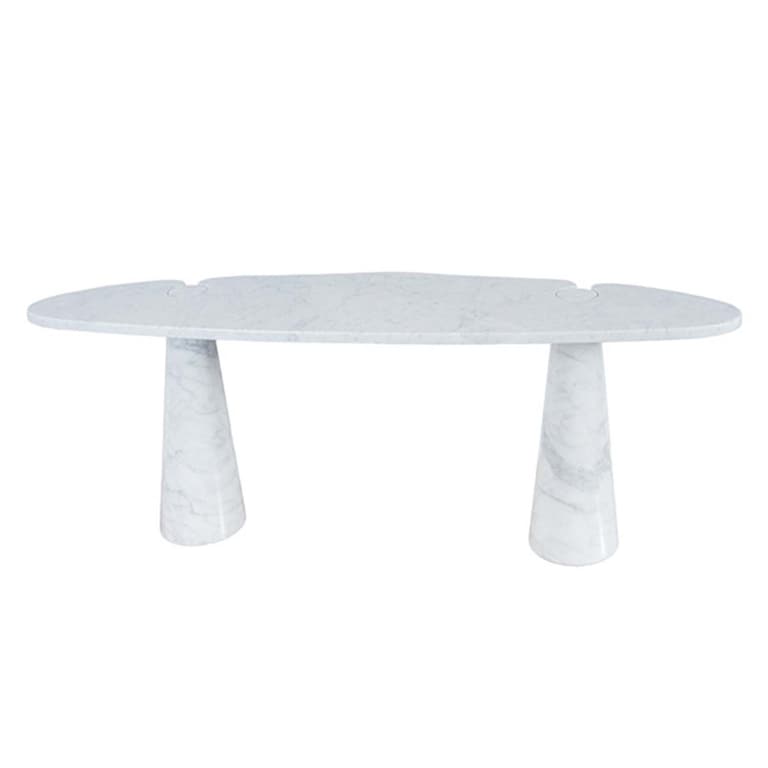 Angelo Mangiarotti est un designer, architecte et sculpteur milanais. Il conçoit en 1971 pour les éditions Skipper la collection Eros composée de tables, consoles et guéridons. Sans fixationni joint, ces pièces de mobilier déjouent les lois de la gravité. Les découpes circulaires des plateaux en marbre accueillent les bases coniques avec précision et élégance, formant le célèbre pied gravitationnel qui assure une élégante stabilité à ces pièces de design.