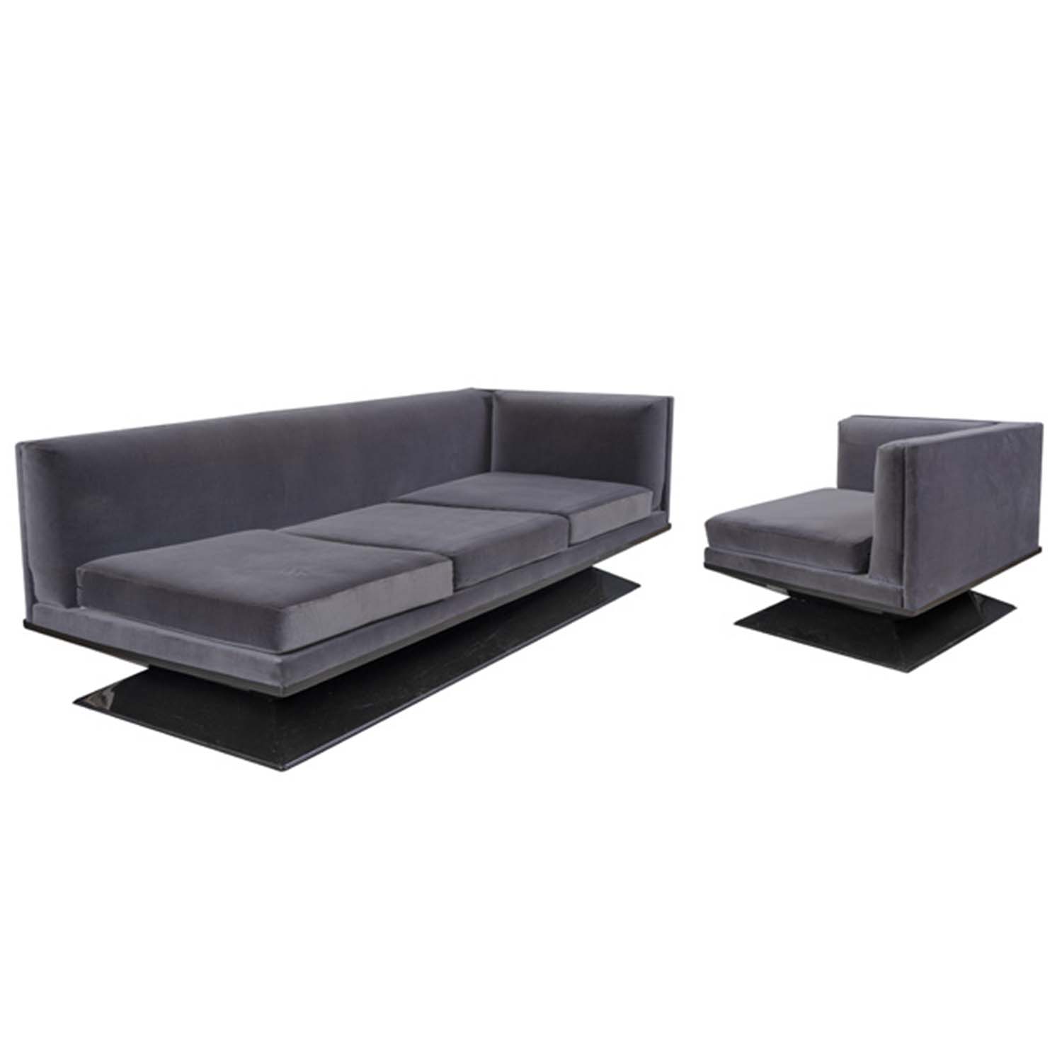 A la fin de la deuxième guerre mondiale, Luigi Pellegrin se forme à la faculté d’architecture de Rome. Il s’installe pendant deux ans aux Etats-Unis et travaille aux côtés de l’architecte William R. Burk. À son retour en Italie, il réalise des chantiers inspirés des travaux de l’inventeur de l’architecture moderne Frank Lloyd Wright. Luigi Pellegrin conçoit en parallèle des pièces de mobilier. D’inspiration moderniste, le sofa et son fauteuil de la série Vignola se composent de modules carrés supportés par des piètements en forme de trapèze. Cette alternance de figures géométriques assure légèreté et équilibre à l’ensemble.