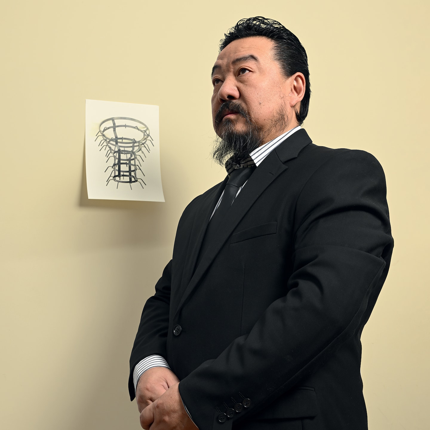 Pour Le Bon Marché Rive Gauche, Song Dong s’inspire du plus célèbre porte-bouteille de l’histoire de l’Art. Sous les verrières centrales, deux égouttoirs immenses et inversés sont suspendus de part et d'autre de l'escalator central. Leurs lumières et leur couleur blanche évoquent le Mois du Blanc, une tradition emblématique initiée au XIXe siècle par les fondateurs du Bon Marché. Pour son premier portrait de 2026, illustrant la campagne de l’exposition, il se représente en vendeur ou portier du grand magasin, vêtu d’un costume noir. Derrière lui, un croquis d’une partie de son œuvre est accroché au mur, clin d’œil au dessin qui joue un rôle central dans la réflexion de l’artiste. À l’occasion de l’exposition, certains de ses croquis sont d'ailleurs exposés au restaurant Primo Piano, au deuxième étage. « J’aime faire des croquis; c’est une expression d’incertitude et de possibilité, libre et sans retenue. L’art, aussi, a toujours été une question d’esquisse », précise Song Dong.