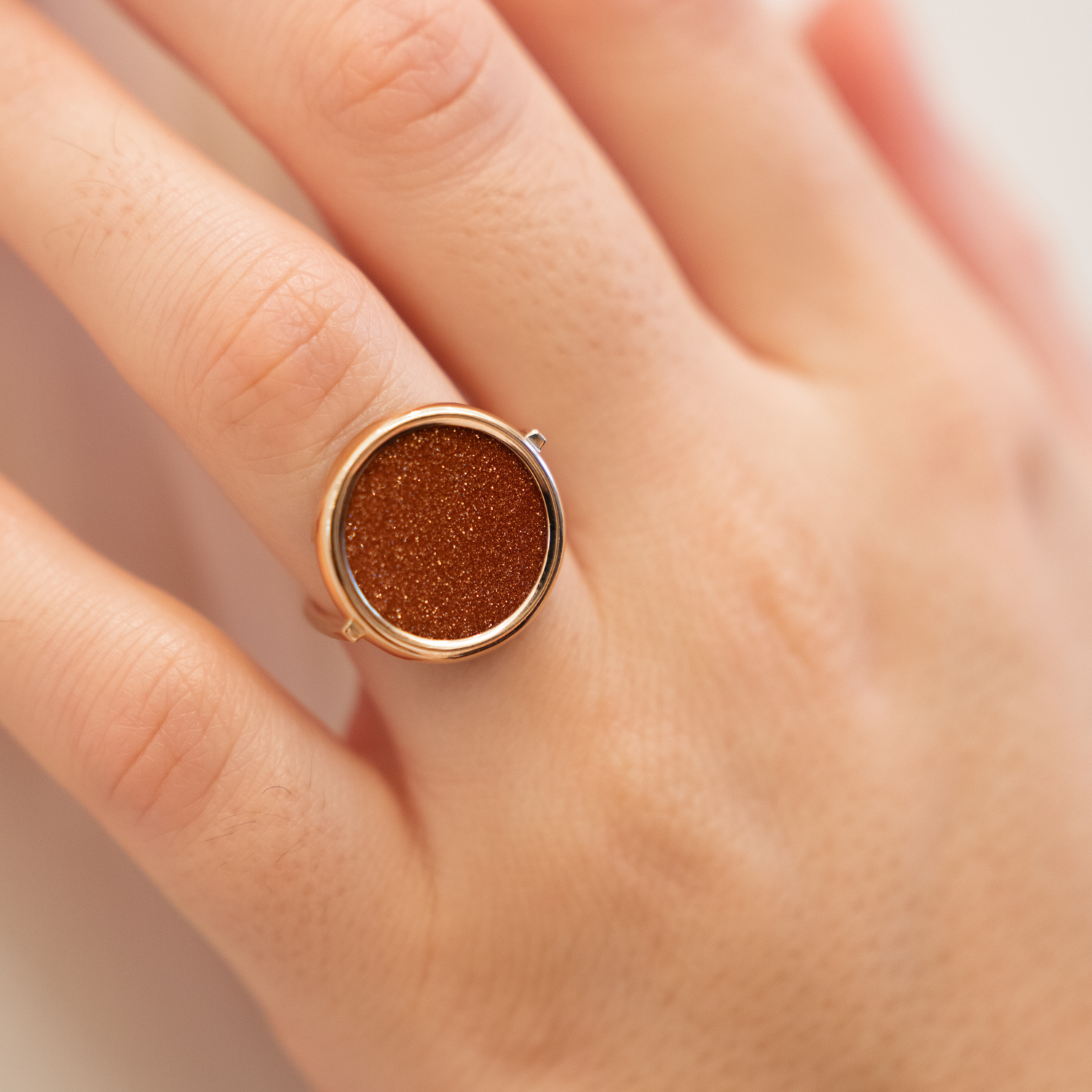 Le bijou : la bague DISC révèle une pierre couleur terracotta, habillée de paillettes d’or.