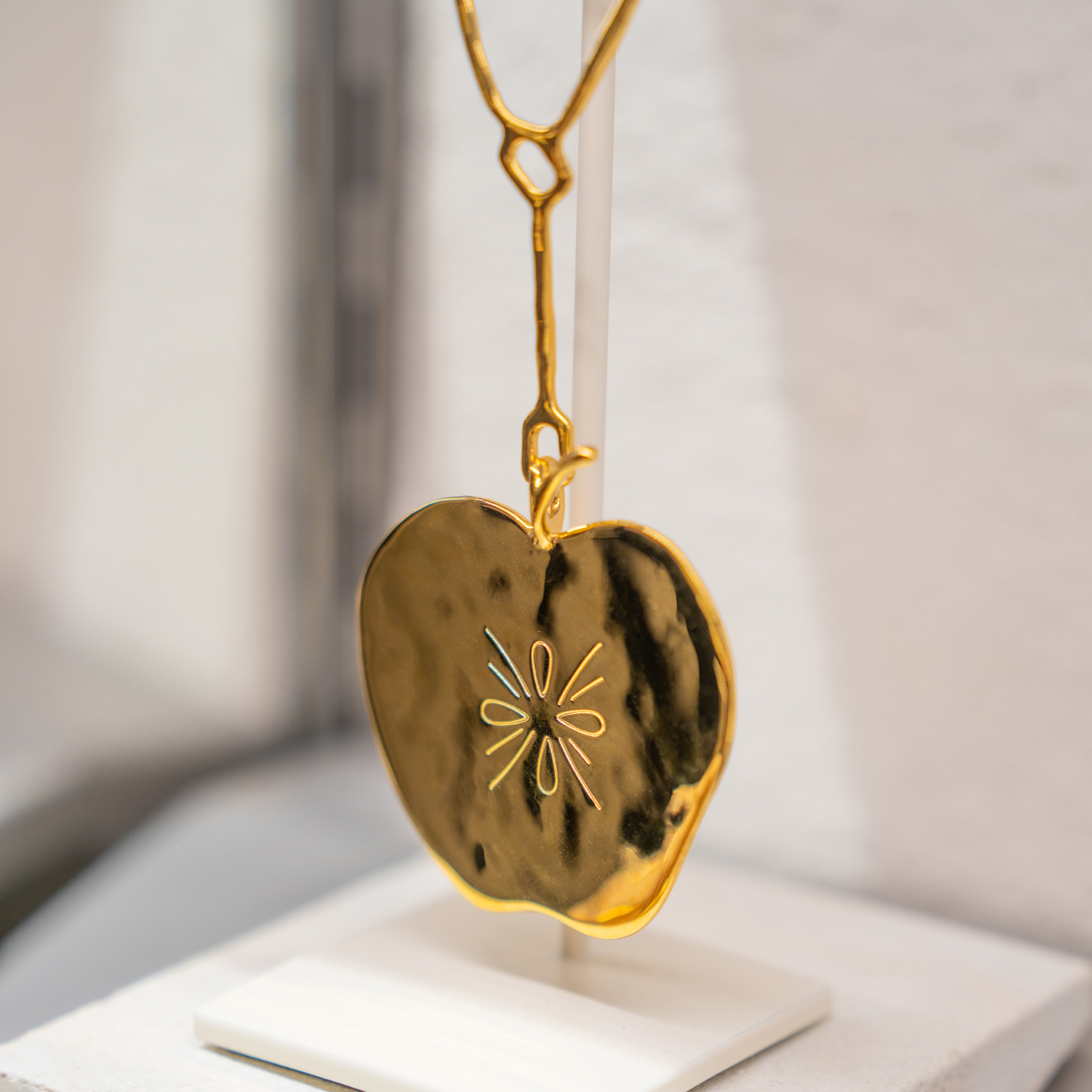 Le bijou : il répond au nom de LAUREN, un sautoir orné en son extrémité d’une pomme dorée. Fruit défendu et splendide. Contours reconnaissables et symboliques. Équilibre trouvé entre audace et simplicité.