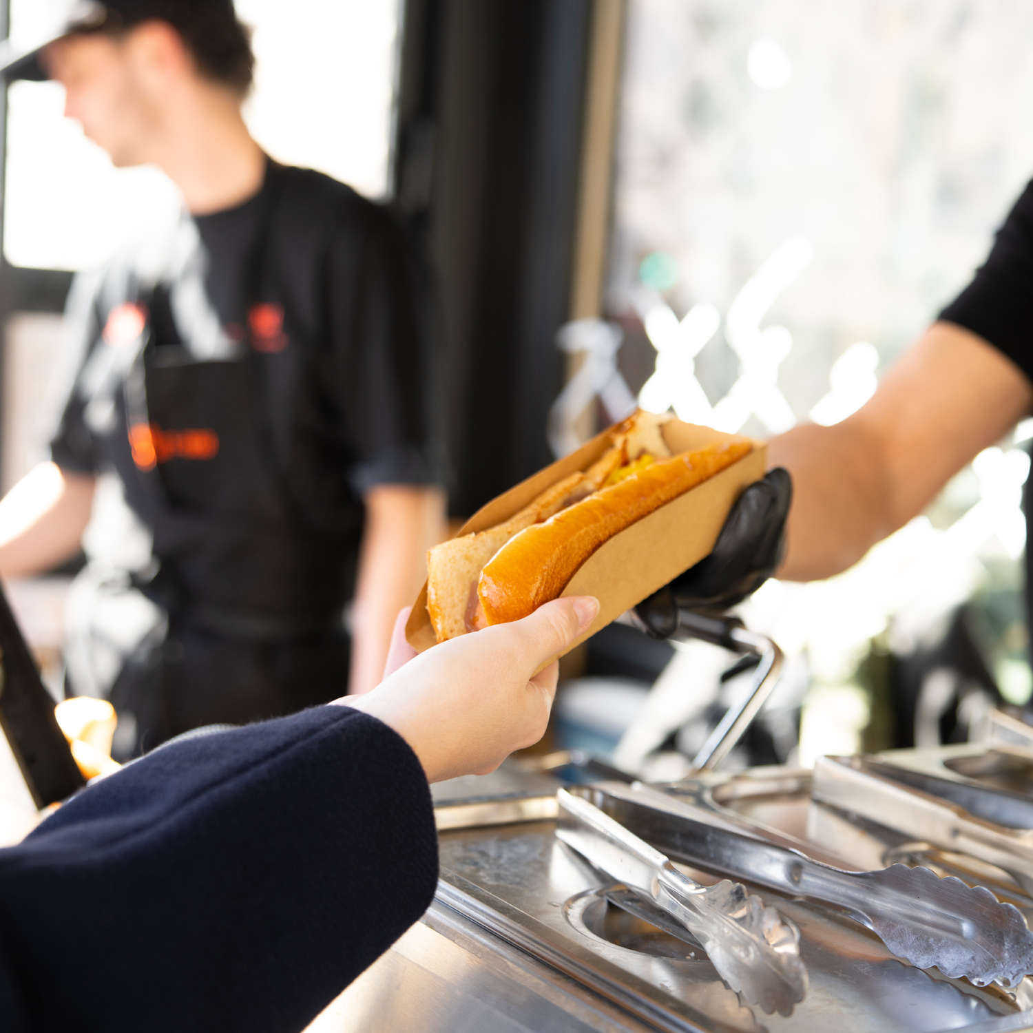 Avant de quitter les allées du Bon Marché, une dernière halte s’impose sous la marquise Art déco de La Grande Épicerie de Paris. C'est là que Now Hot dog a installé son kiosque, offrant une sélection de hot-dogs revisités. Trois versions sont proposées — porc, poulet ou végétarien — accompagnées de sauces maison, pour une pause savoureuse sur le pouce.