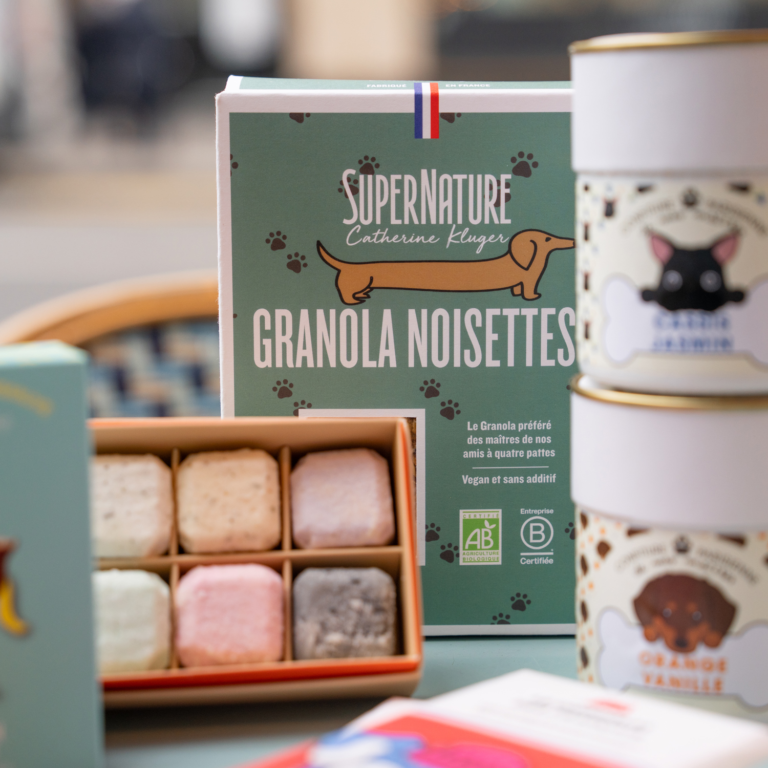 L’heure est à la pause gourmande avec Super Nature. La marque propose un granola croustillant, alliant noisettes et sirop d’érable, parfait pour démarrer la journée avec énergie ou prolonger une balade au parc. De son côté, Maison Carrousel réinvente la guimauve avec une tendresse infinie : une douceur aérienne, délicate et régressive, qui rappelle les instants de tendresse partagés avec son toutou.