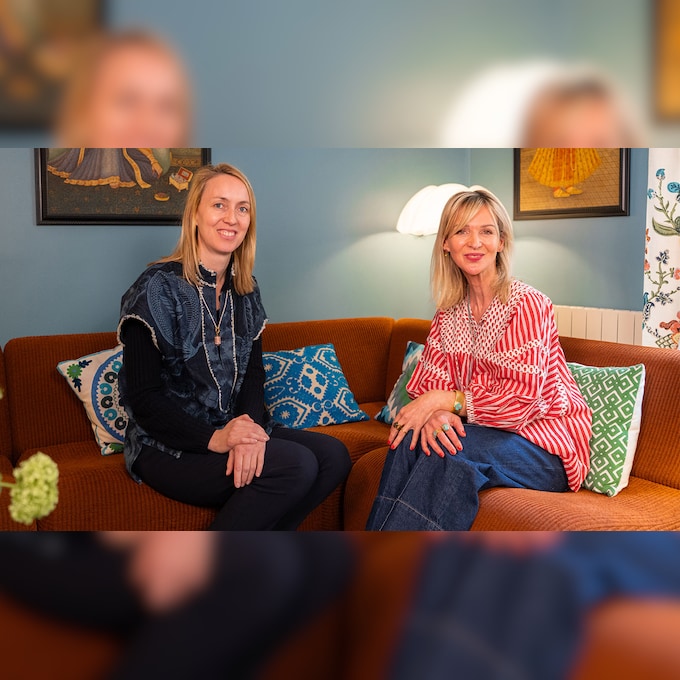 Entrer chez Caroline de Benoist, c’est pousser la porte d’un monde enchanté. Oubliez les codes haussmanniens, le blanc, le beige et les nuances fumées. Pour contrer la grisaille de la capitale, la créatrice a fait de la couleur son fil rouge. Perchée dans une maison de ville sur quatre niveaux, elle nous accueille chez elle avec un grand sourire, cet accessoire qui semble ne jamais la quitter. Du sol au plafond, les tapis colorés se superposent, les textiles tissent les murs, les motifs ont la part belle. Il règne ici un ordre joyeux, libre et spontané — à l’image des collections de la créatrice, qui y vit depuis près de 15 ans avec son époux et leurs quatre enfants. Après une volée de marches, on retrouve au salon Jennifer Cuvillier. Les deux femmes se mettent alors à deviser.