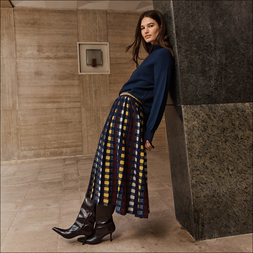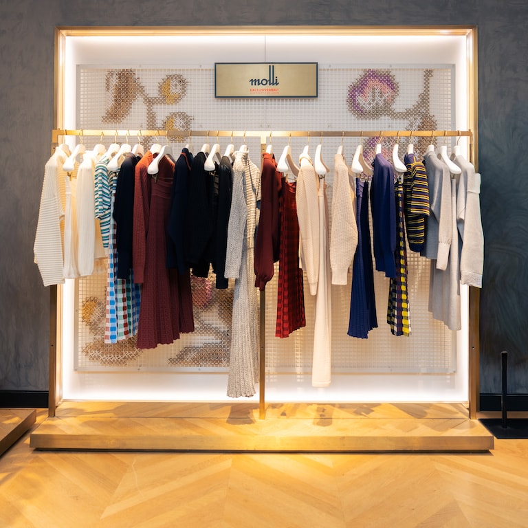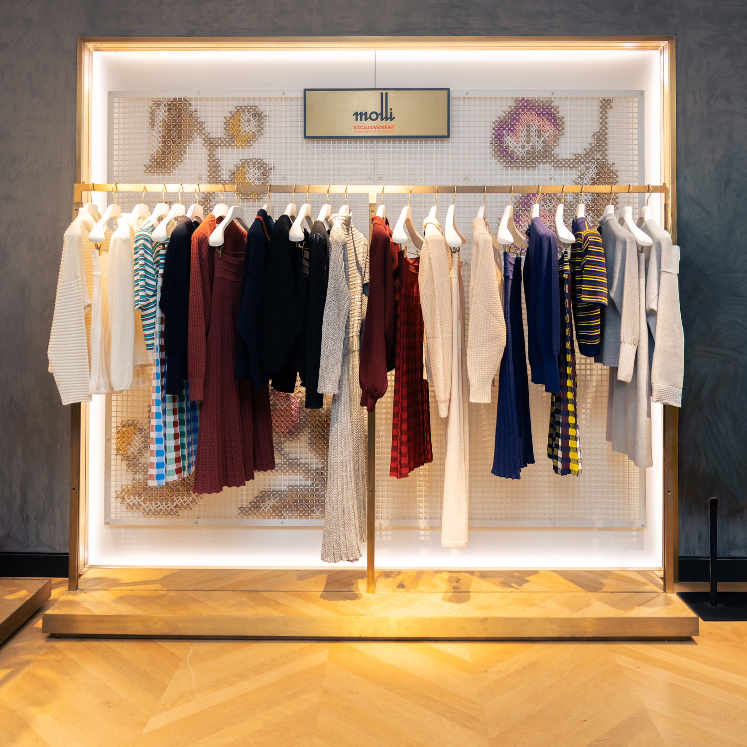 « La qualité des produits Molli n’était pas à prouver. Mais qu’allais-je apporter de nouveau ? J’ai très vite fait le choix de proposer un vestiaire féminin, centré autour de cette maille si identitaire. Mais une amie m’avait mise en garde en me disant à quel point la maille était une matière technique, très difficile à travailler. Elle était elle-même diplômée du Studio Berçot et avait fait toute sa carrière dans la mode. Moi qui n’ai aucune formation couture, c’est dire à quel point je lui faisais confiance… C’est elle qui m’a fait rencontrer la styliste qui dessine et développe les pièces Molli depuis dix ans. Je me rappelle son arrivée, avec son book sous le bras. Je n’avais jamais recruté de styliste, alors j’ai fait confiance à mon intuition. Dix ans plus tard, je peux dire qu’elle ne m’a pas trompée. »
