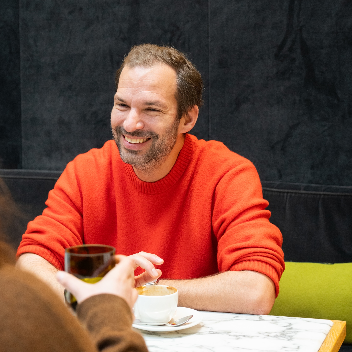 — Nicolas commande un café. Il porte un pull rouge, vibrant. Quelques viennoiseries sont disposées au centre de la table. La conversation se poursuit.