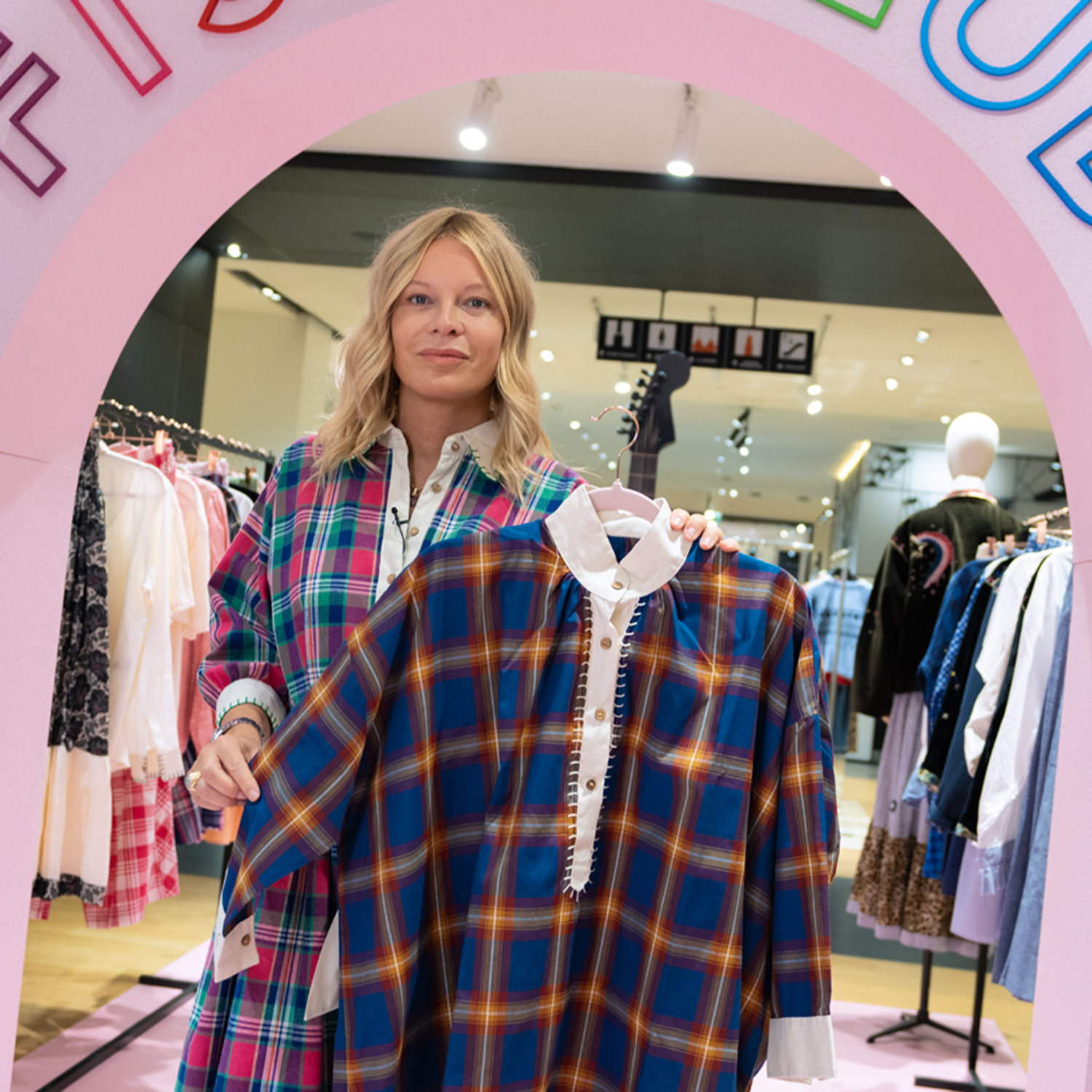 « Pour l’exposition artistique Rock’n’Drôle, nous avons un grand espace au 1er étage du magasin. Moi qui ai une passion pour le rock des années 70-80, mettre en avant la marque à cette occasion nous parlait beaucoup. Pour le côté rock bien sûr, mais aussi, car nous créons toujours avec de l’existant, l’upcycling est au centre de nos processus. Pour l’exposition, nous avons conçu des pièces exclusives. J’ai notamment mis la main sur des stocks de t-shirts vintages (neufs !) que nous avons découpés et rebrodés à la main. Nous avons aussi imaginé des vestes « Music » avec le titre de chansons mythiques brodées sur l’envers. »