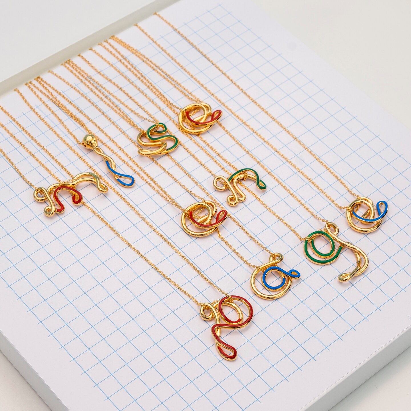 Avec ses bijoux délicats, Vanrycke prône l'élégance discrète. Pour l’exposition, la Maison présente des lettres dans un style antique, taillées et gravées à la main. Une gamme exclusive en vermeil, à porter sur une chaine fine autour du cou ou en boucles d’oreilles.