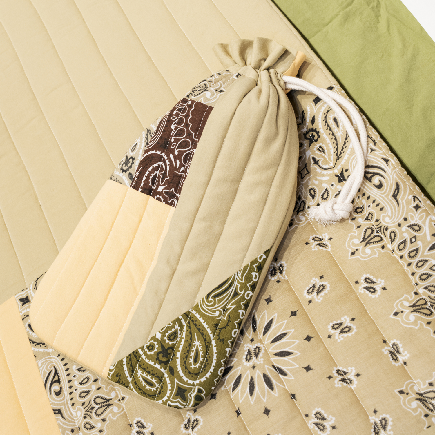 Ici, le bandana se décline sous toutes ses formes et vient s'associer pour la première fois aux belles matières dormantes de la collection de linge de lit du Bon Marché. Des pièces exclusives, aux couleurs à la fois douces et joyeuses : un étui à bouillotte, un coussin, une couverture ou encore des draps délicatement brodés. Chaque pièce est unique et prend forme grâce à un assemblage de chutes de tissus provenant des collections maison et de bandanas upcyclés.