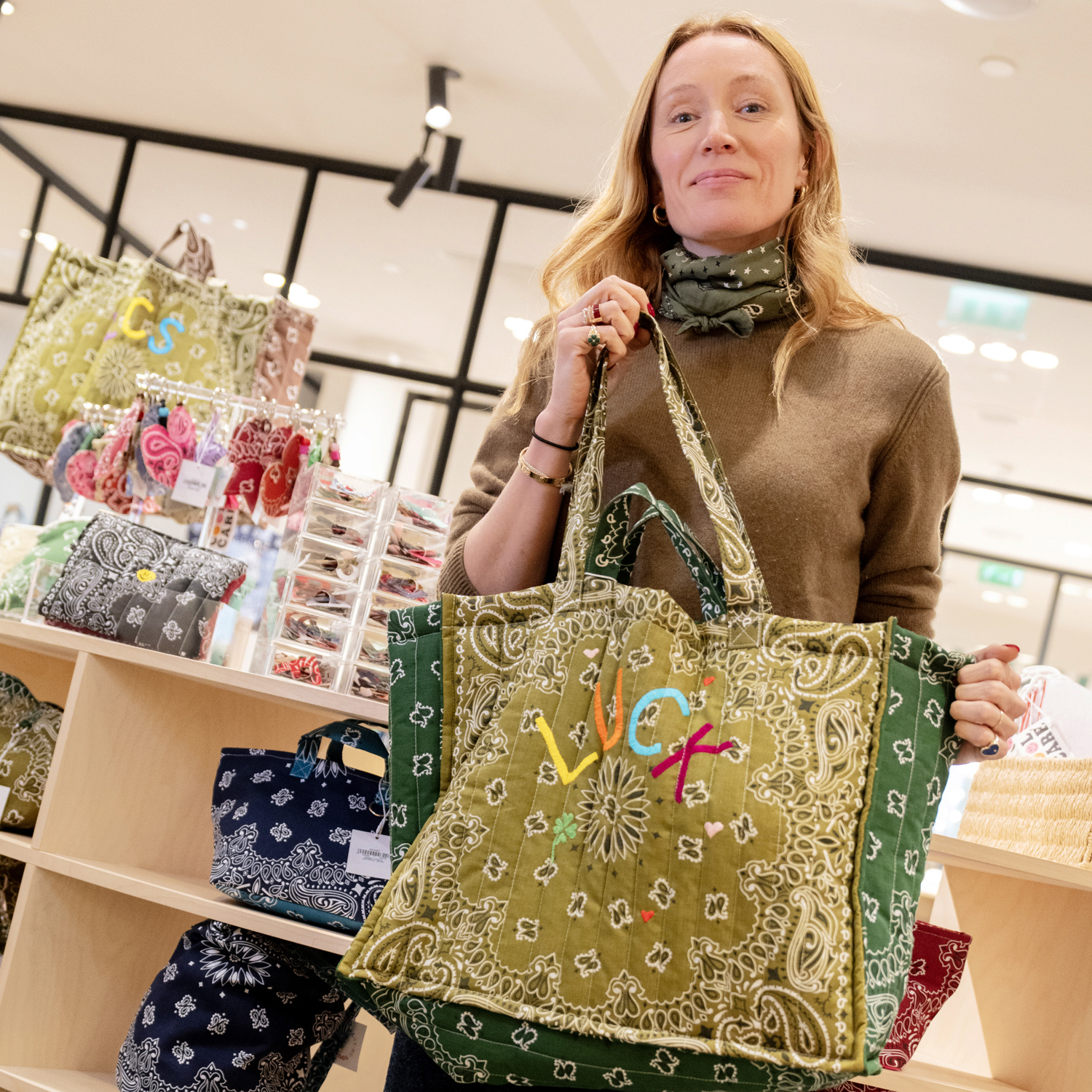 Colombe Campana, fondatrice de Call It By Your Name, associe bandanas et broderies aux belles matières dormantes des collections de linge de lit du Bon Marché. Une belle manière d’allier douceur et esthétique singulière, tout en leur donnant une nouvelle vie.