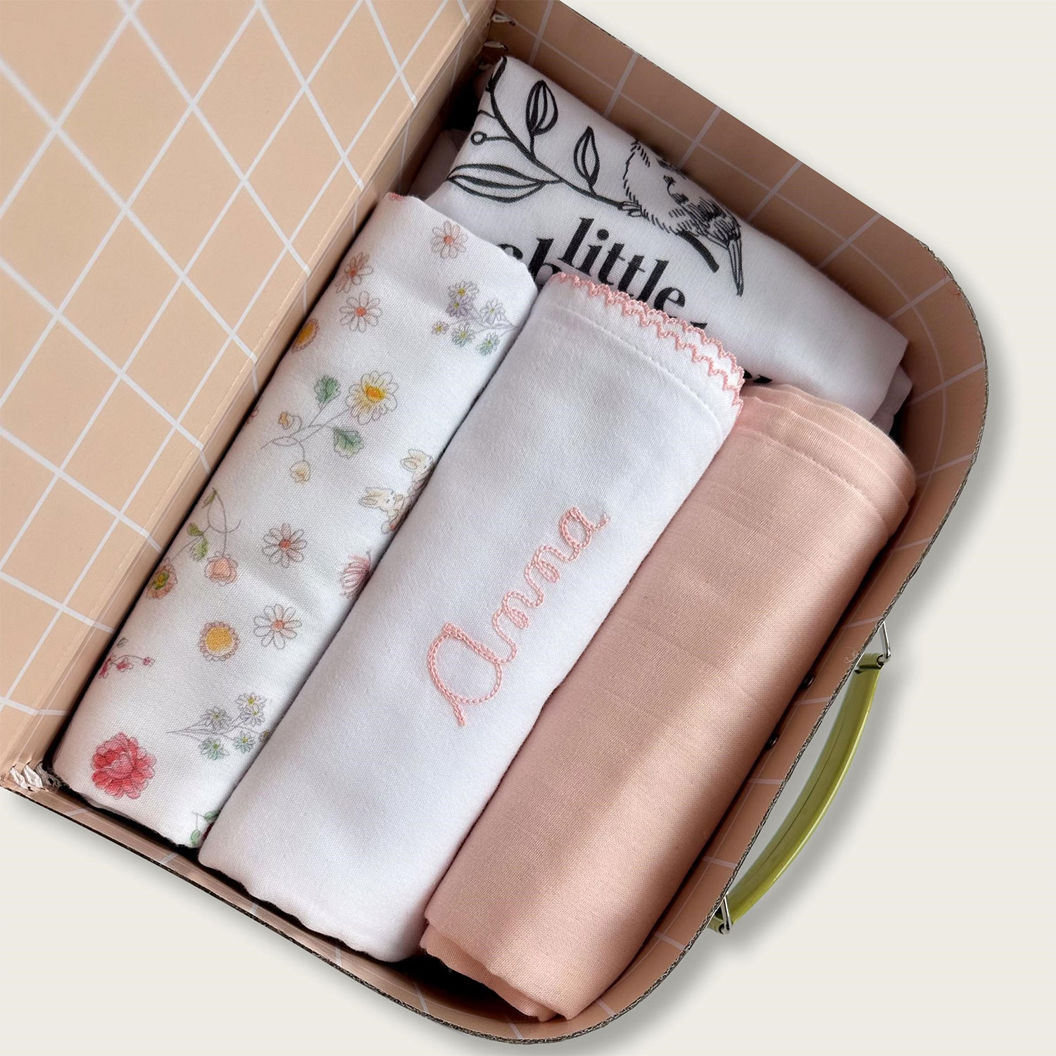 Un coffret de trois langes qui deviendront de véritables alliés pratiques et nomades des parents dans de nombreuses situations. Le prénom du bébé peut être brodé sur l’un des trois langes avec un lettrage délicat, réalisé avec une machine guidée main du début XXème.