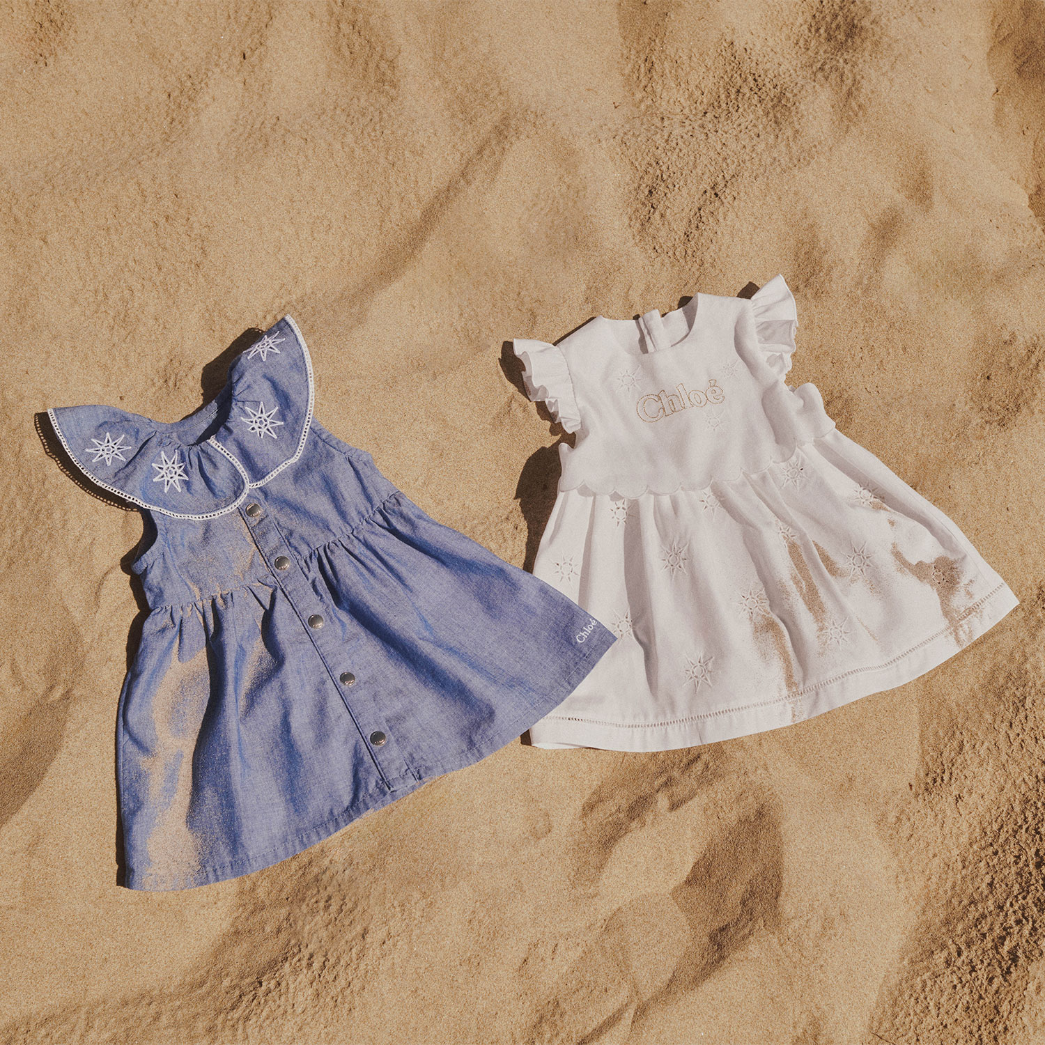 Pour le printemps-été 2024, les bébés auront la tête dans les étoiles. Chloé parsème cet inspirant motif sur de délicates robes en voile de coton. Autres signes distinctifs : les broderies anglaises et le denim léger que l’on retrouve sur différentes pièces, dont un sac à langer et des bloomers.