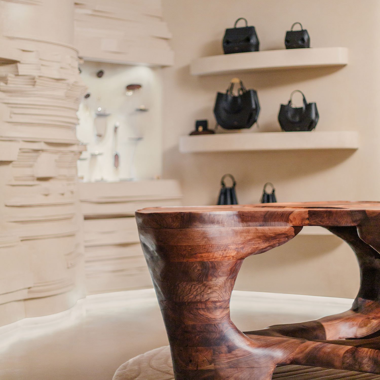 Au centre, une table sculpturale, prénommée « Racine », et creusée dans le bois par un artisan ébéniste en France, rappelle avec poésie la forme organique d’un arbre. Sa présence réitère l’attachement de Polène à valoriser l’artisanat local au sein de ses boutiques.