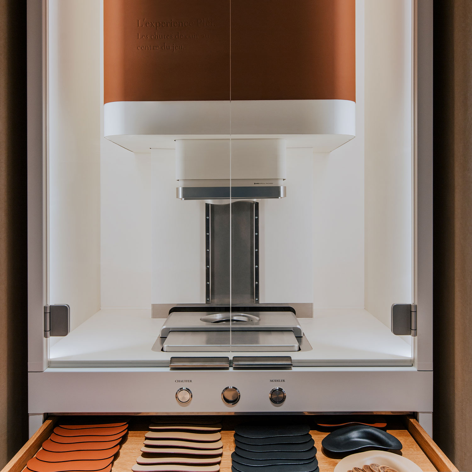 Pour Le Bon Marché, Polène imagine une machine à thermoformer, qui remodèle instantanément des chutes de cuir en de jolis et nouveaux objets. Après réception d’un jeton remis en caisse, vous avez la possibilité de choisir une couleur de cuir et voir sa chute se transformer sous l’effet chauffant de la machine. À la clé ? Un vide-poche à l’esthétique épurée et organique embossé du pictogramme Polène.