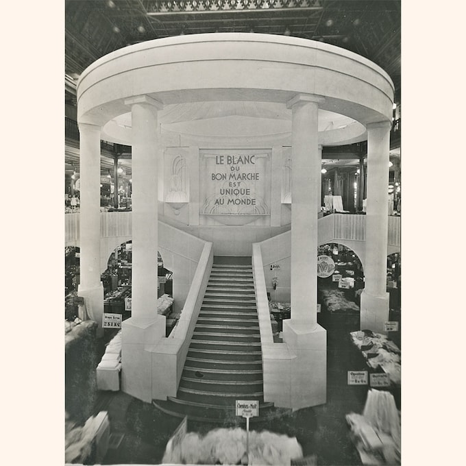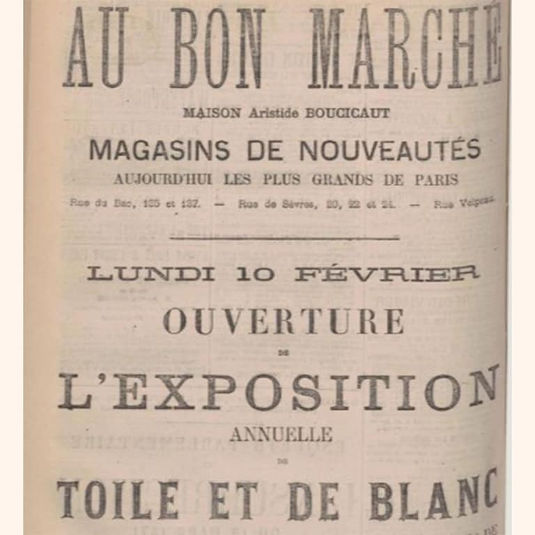 Dès les années 1870, la clientèle trouve au Bon Marché tout ce qui concerne l’habillement, la parfumerie, la papeterie, mais aussi les arts de la table et les arts ménagers. Le renouvellement constant de l’offre est assuré par le développement d’un calendrier commercial, marquant la saisonnalité des collections et créant autant de rendez-vous pour la clientèle. Parmi eux figure la « quinzaine du Blanc », qui deviendra bientôt le mois du Blanc, événement devenu un incontournable du mois de janvier.
