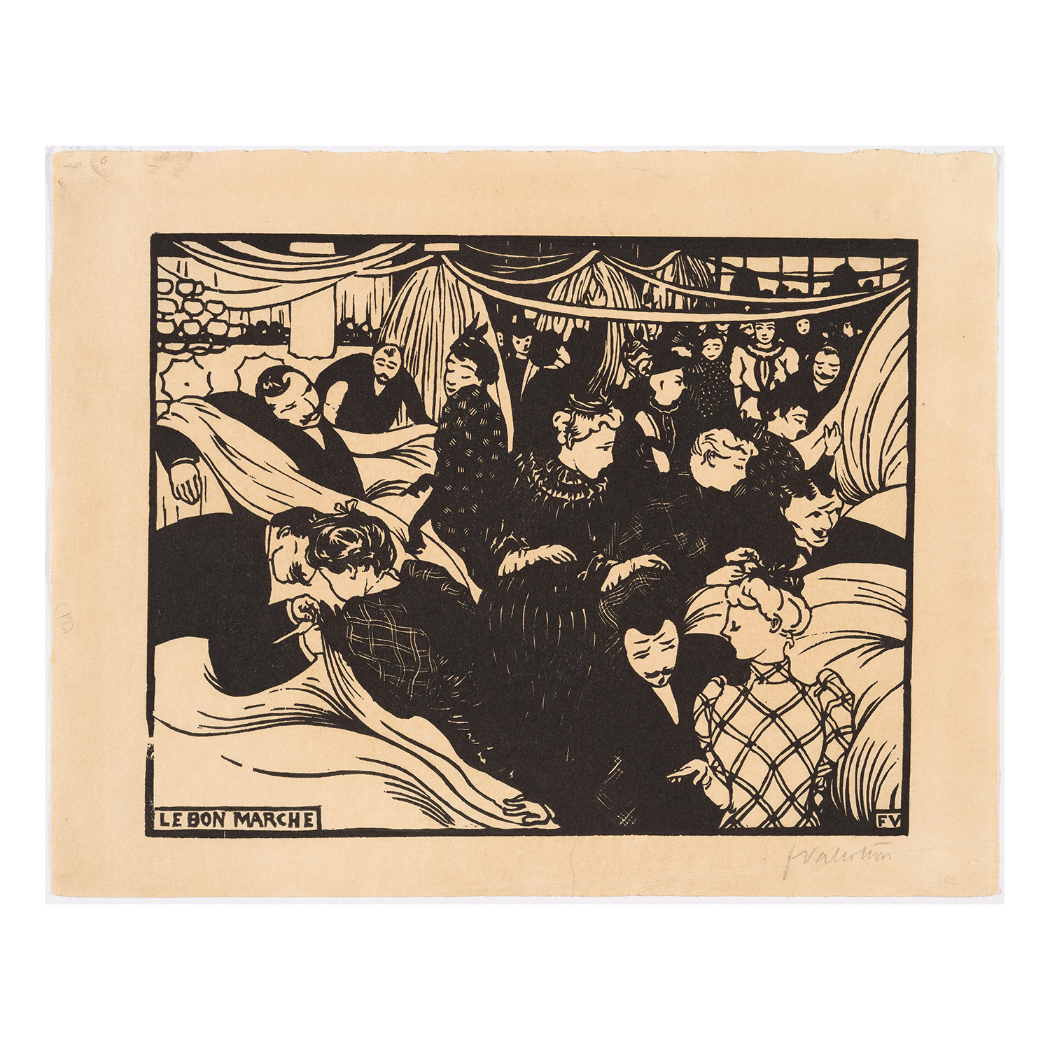 A la fin du XIXème siècle, Le Bon Marché devient une source d’inspiration en lui-même. Félix Vallotton, peintre, mais aussi illustrateur, critique d’art et sculpteur reconnu, réalise en 1893 une gravure qui incarne parfaitement l’ébullition du grand magasin. La composition dynamique en noir et blanc représente les différents drapés des rayons semblant accueillir confortablement une masse effervescente formée par la clientèle et les employés de la Maison Boucicaut.