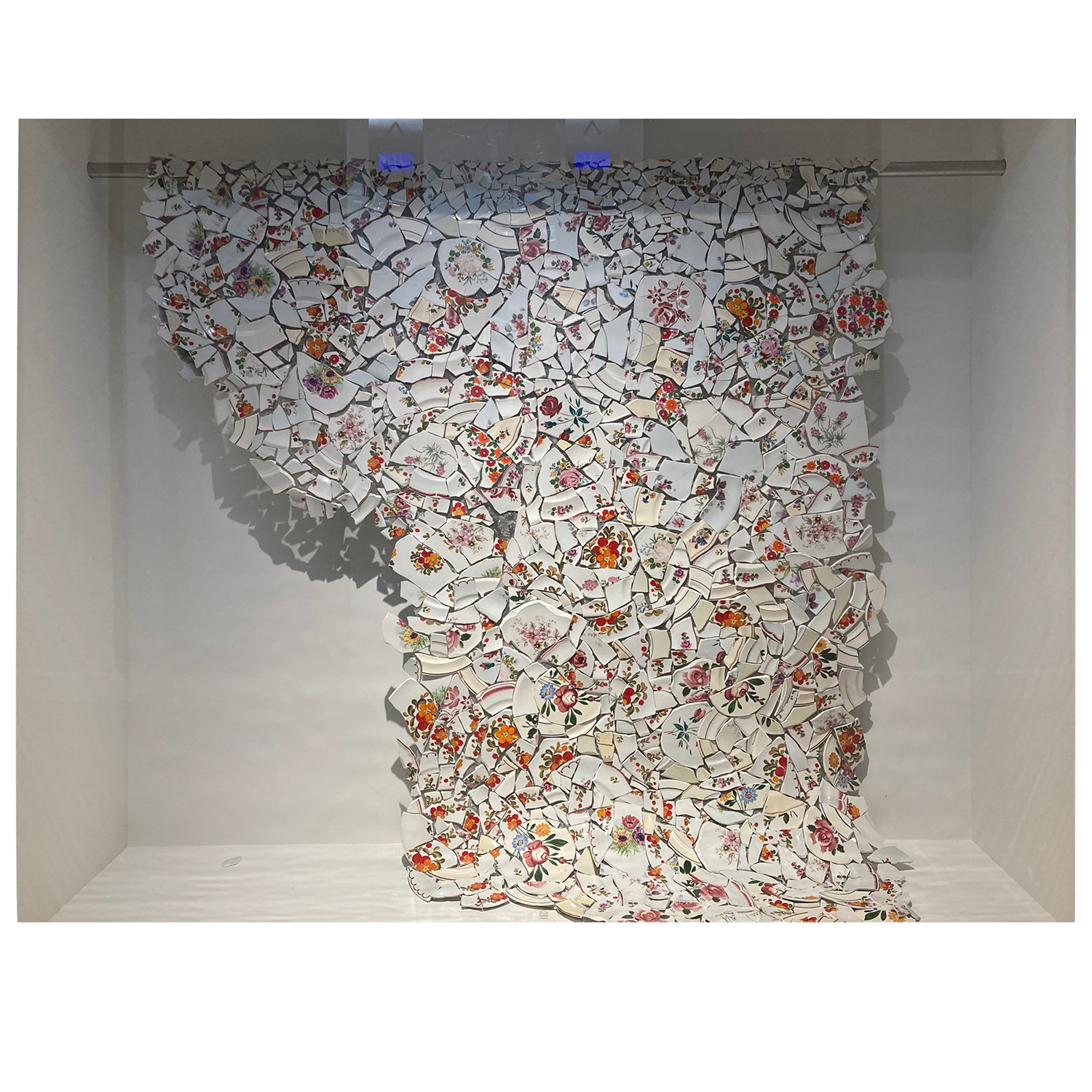 L’artiste indien Subodh Gupta présente en 2023 l’exposition « Sangam » (confluence en hindi), dont une série d’installations composées d’objets chinés dans les vitrines de la rue de Sèvres et de Babylone. L’artiste interroge notre regard sur leurs vies manufacturées passées. Il utilise pour la première fois des morceaux de faïence colorés provenant de vaisseliers sourcés en Ile-de-France et les transforme en un élégant drapé en mosaïque aux motifs fleuris.