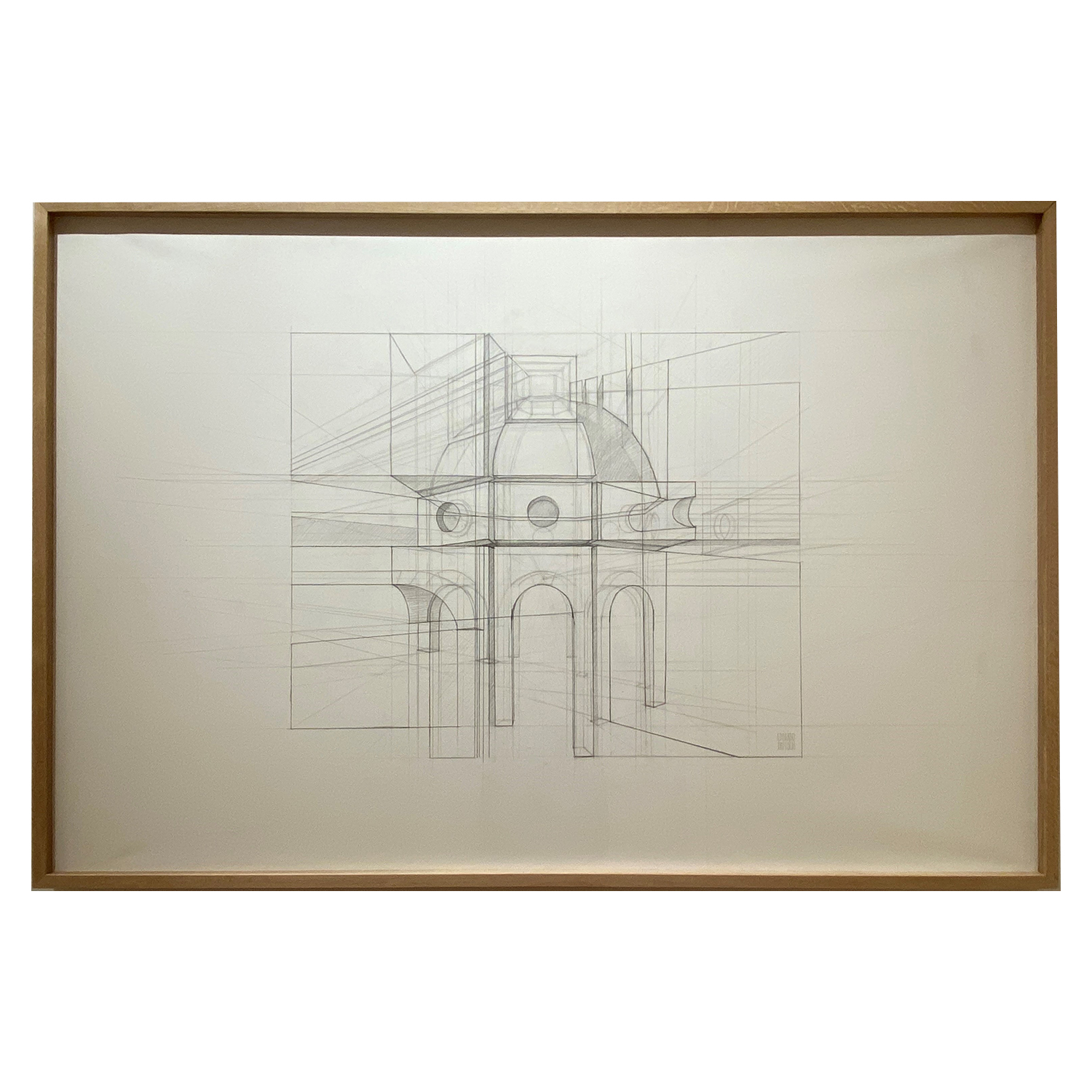 A l’occasion de l’exposition « La Famiglia » présentée au Bon Marché Rive Gauche en 2017, l’artiste italien Edoardo Tresoldi imagine deux dômes inspirés de l’architecture de la Renaissance, suspendus au-dessus des verrières centrales du magasin. Ces installations, réalisées en fil de fer et en tôle font cohabiter la beauté des références architecturales avec la modernité des matériaux employés. Ce dessin préparatoire évoque avec délicatesse la puissance évocatrice de ces ruines contemporaines.