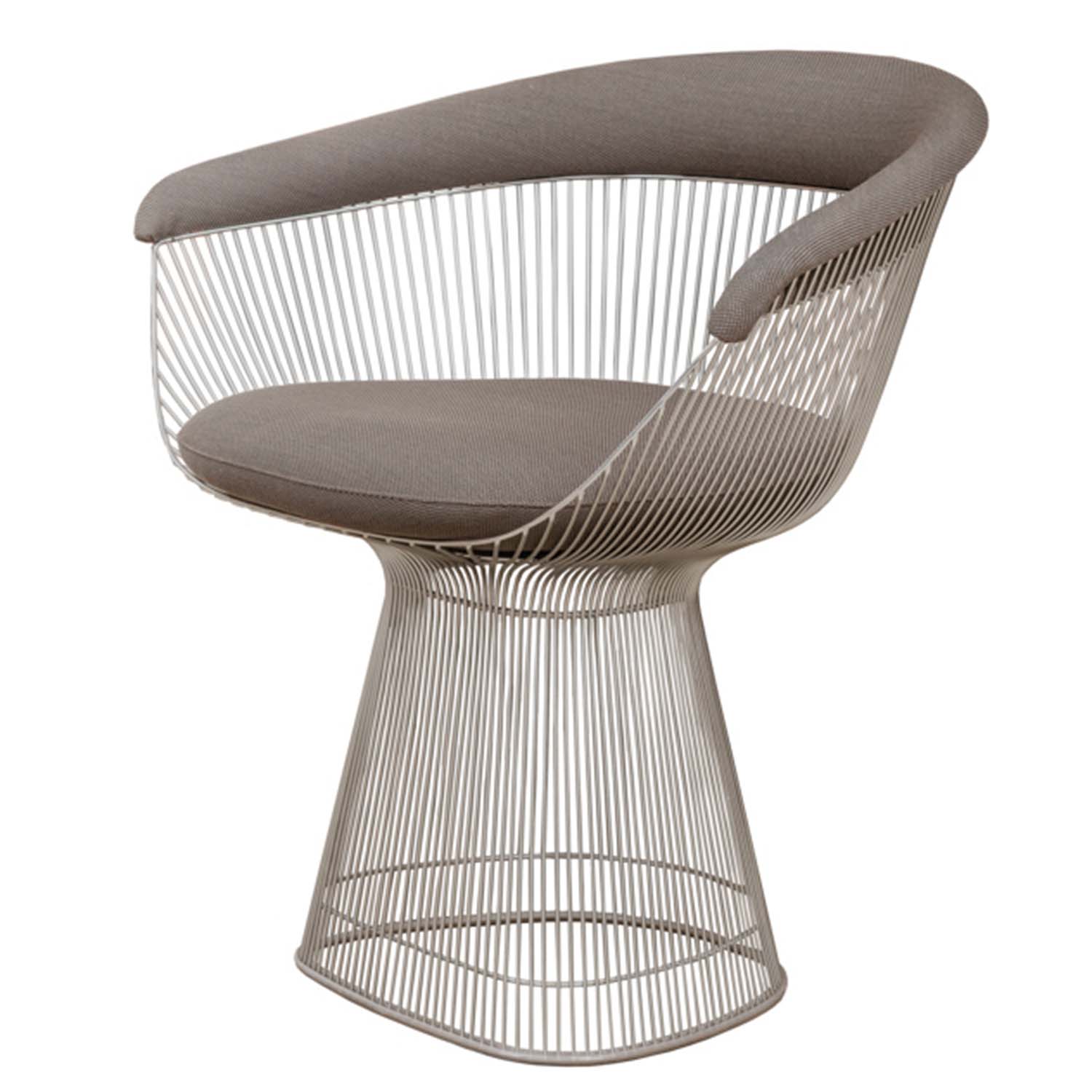 A la suite de ses études en architecture à l’Université de Cornell, Warren Platner collabore avec Raymond Loewy et Eero Saarinen. Il réalise une collection de pièces de mobilier intitulée Platner pour la société Knoll qui devient une référence pour l’univers du design dans les années 1950. Son fauteuil imaginé en 1966, se compose d’une base sculpturale formée d’un faisceau de tiges en acier. L’assise et le dossier rembourrés offrent selon l’auteur des formes « décoratives, douces et gracieuses ». Cette pièce est décrite comme une gerbe de blé scintillante dont le maillage complexe joue avec l’espace.