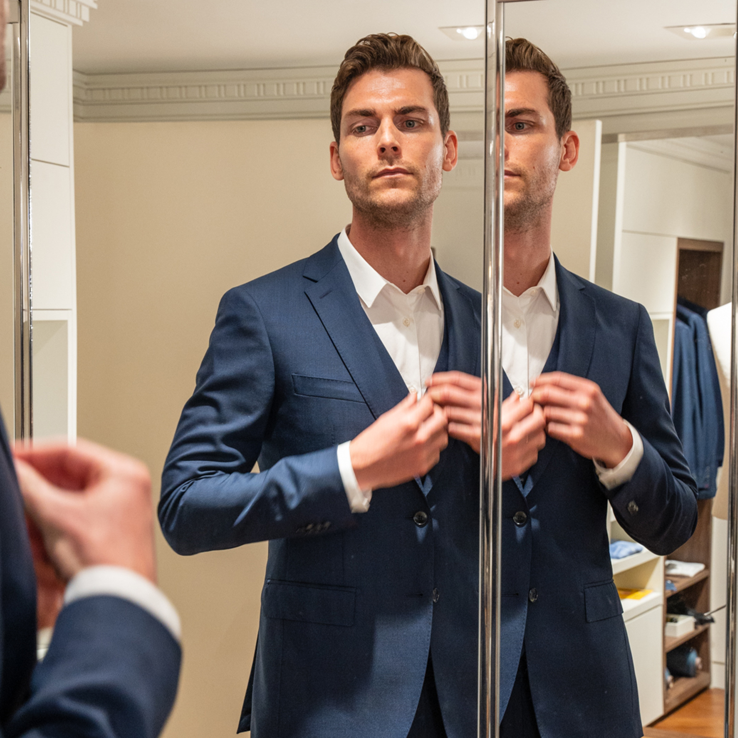 Choisissez le tissu, les couleurs, les boutons, la doublure, les poches ou encore le col des vestes de costume et chemises pour une garde-robe unique.