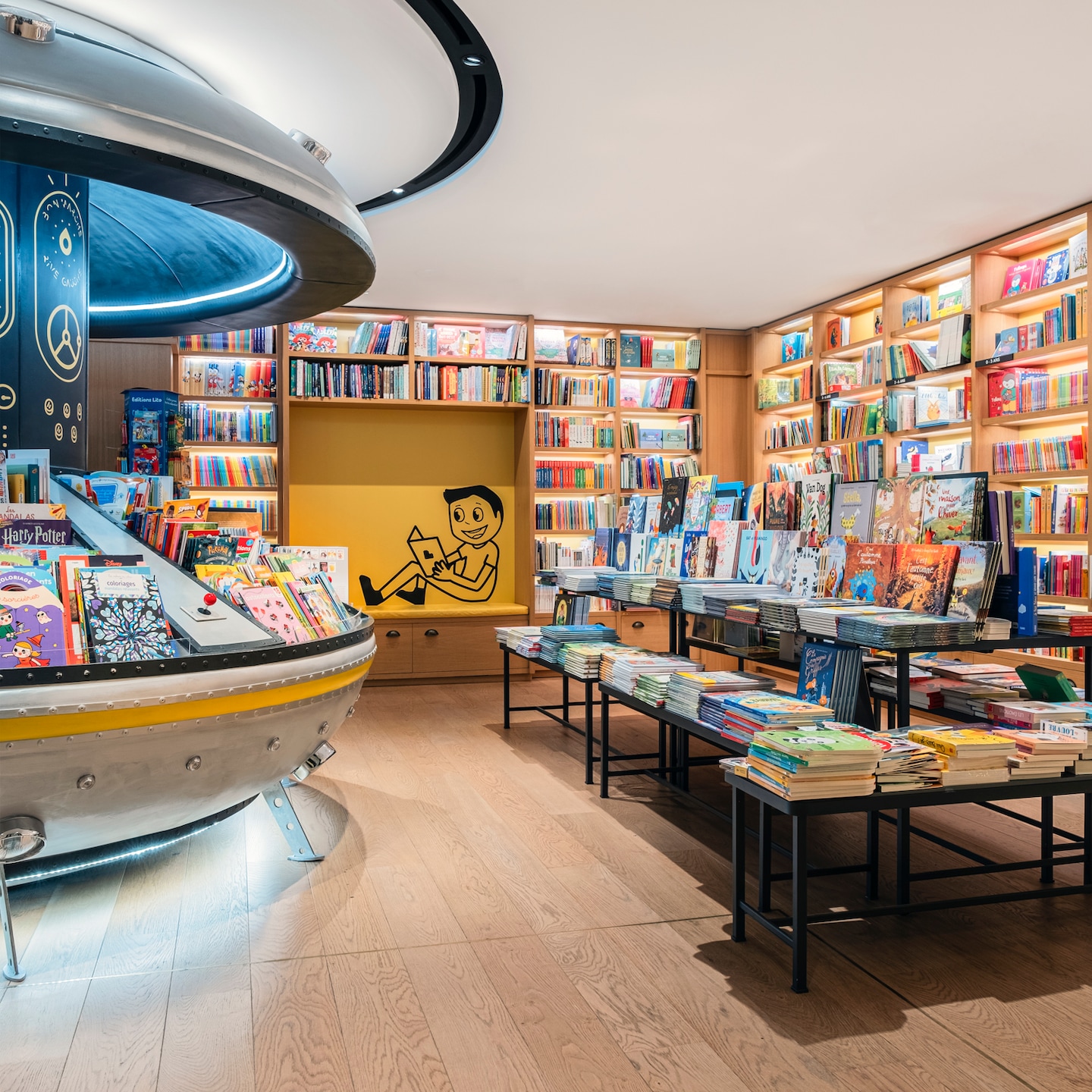 Dans la Librairie Jeunesse, un élément aimante le regard. Il s’agit d’un présentoir de livres en forme de soucoupe volante. Un décor, tout droit sorti d’une BD féérique, qui fascine les plus petits et fait sourire les adultes. Autour de ce qui était à l’origine un pilier imposant transformé par les décorateurs, est disposée une sélection de livres pratiques, de bandes dessinées à ne pas rater et d’ouvrages spécialisés (en sport, en monde animalier, etc). Piochez ce qui vous intéresse, lisez les premières lignes confortablement assis sur l’une des banquettes et repartez avec un texte dont il vous tardera de découvrir la suite.