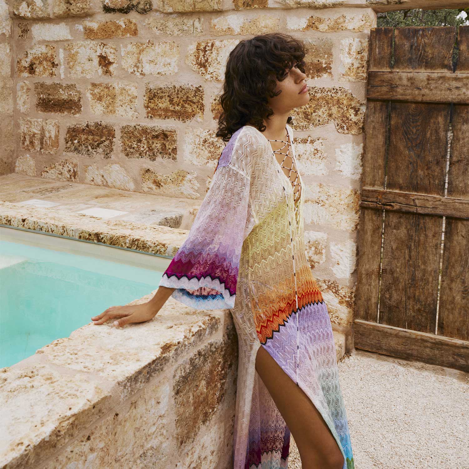 Cette saison, Missoni décline à la perfection son ADN graphique à travers une collection solaire, qui s’inspire des nuances en dégradé d’un coucher de soleil. Le décolleté et les jeux de laçage apportent un rendu féminin. Très pratique, cette pièce fluide en viscose s’enfile facilement au-dessus de votre maillot bain ou juste avant de débuter la soirée, dans un esprit confort. Une invitation à l’évasion du corps et de l’esprit.