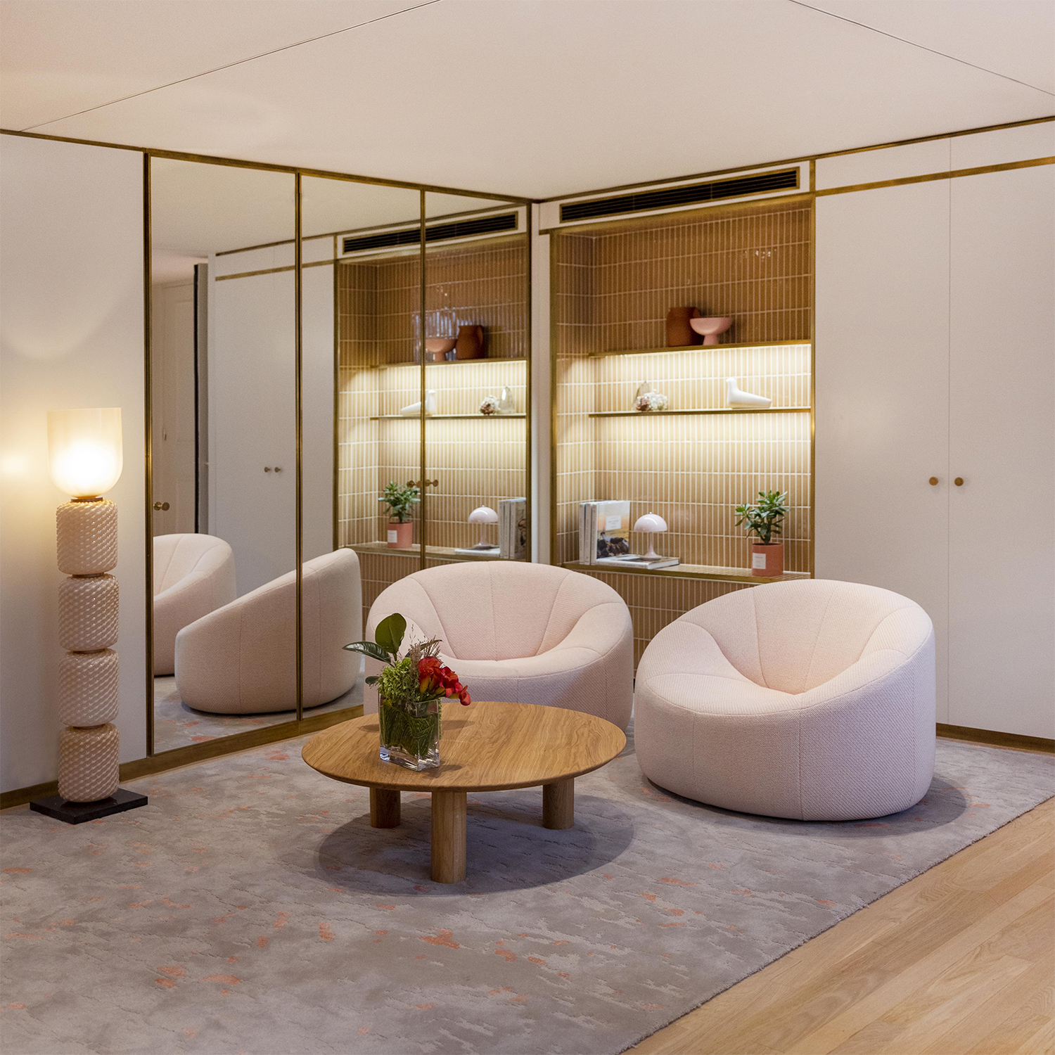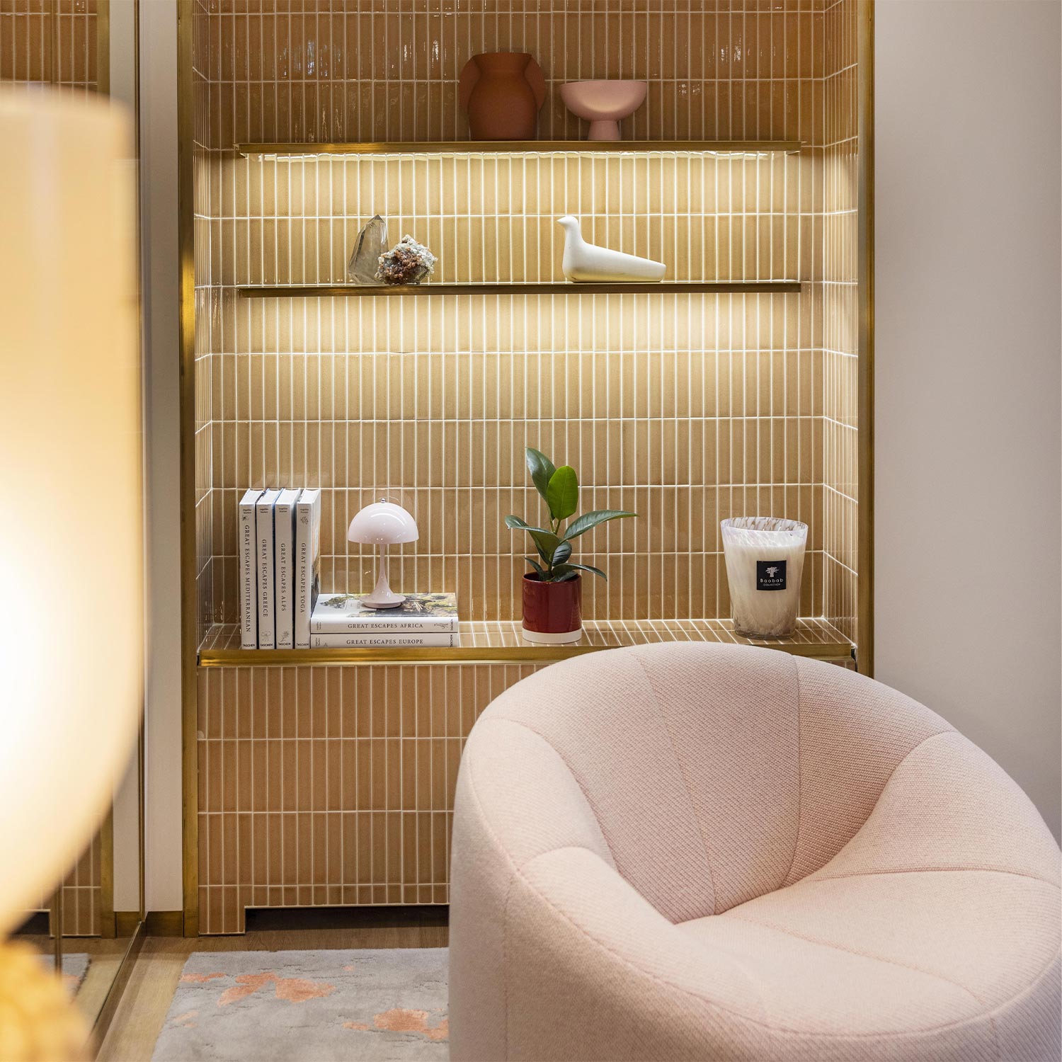 L’idée initiale de ce projet était de travailler tout en rondeur et en féminité pour apporter de la douceur au lieu. Nous retrouvons des courbes dans chaque espace de l’Institut, depuis le hall d’accueil jusque dans les douches des cabines, en passant par les détails du plafond.
