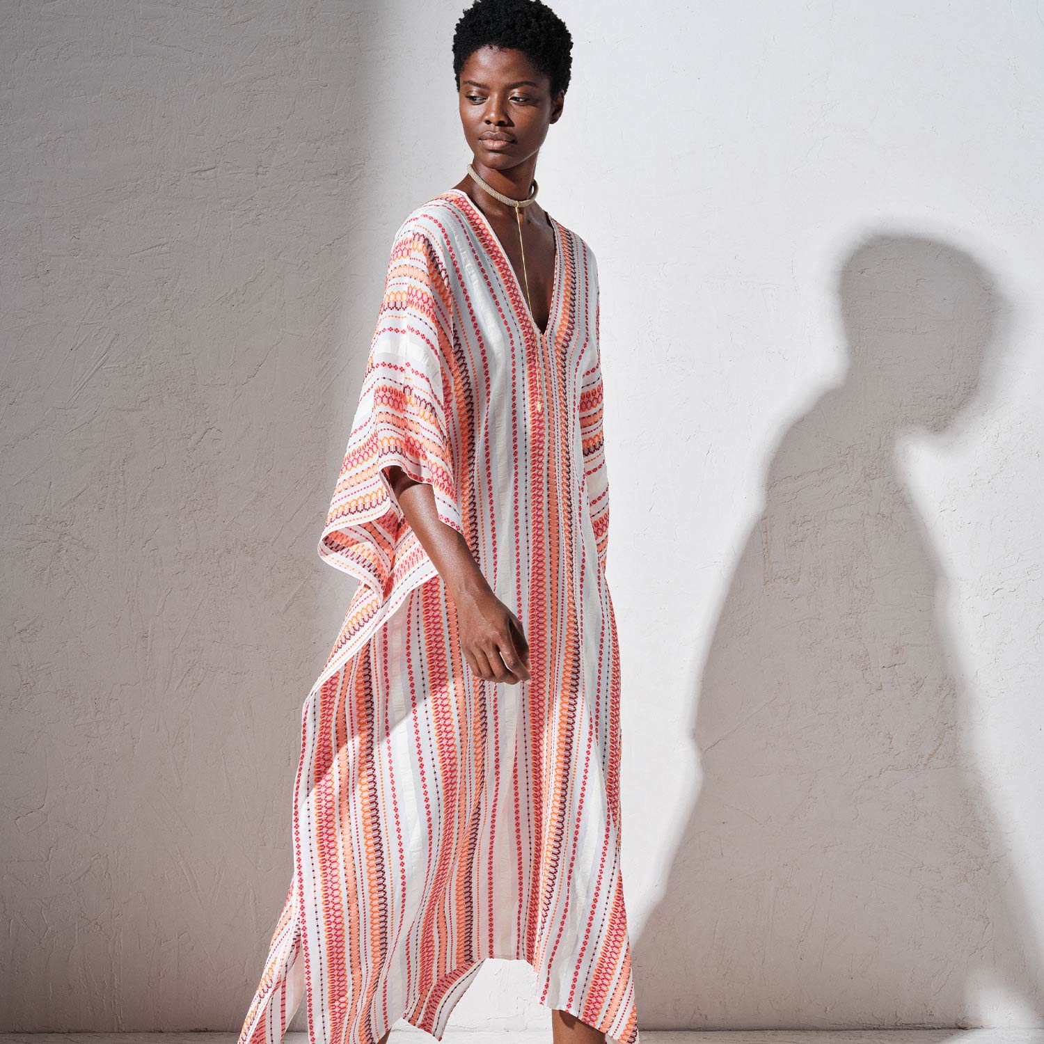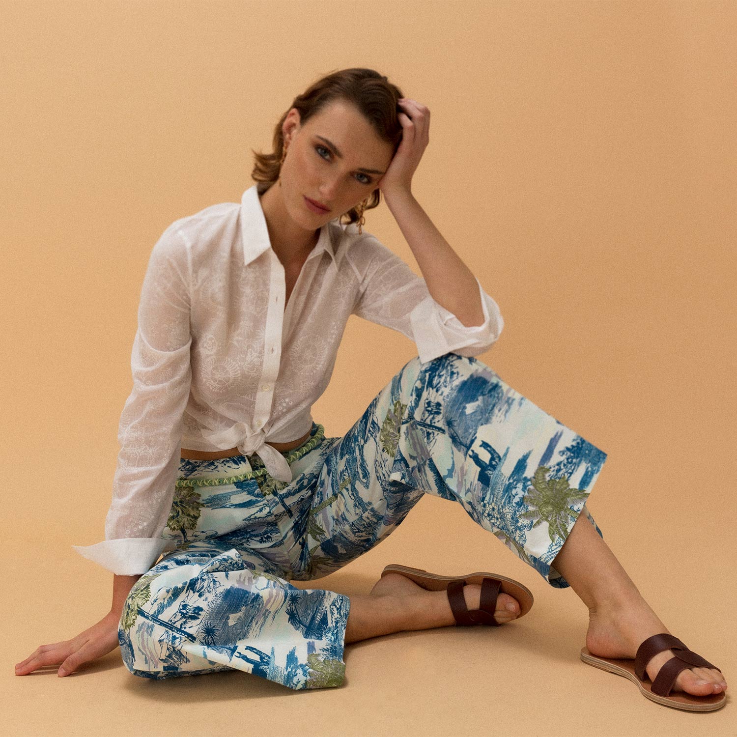 Ce qui nous plait par-dessus tout ? Les matières fluides, les broderies subtiles, les couleurs chaleureuses et les imprimés uniques, comme cette toile de Jouy revisitée inspirée du célèbre Vésuve.