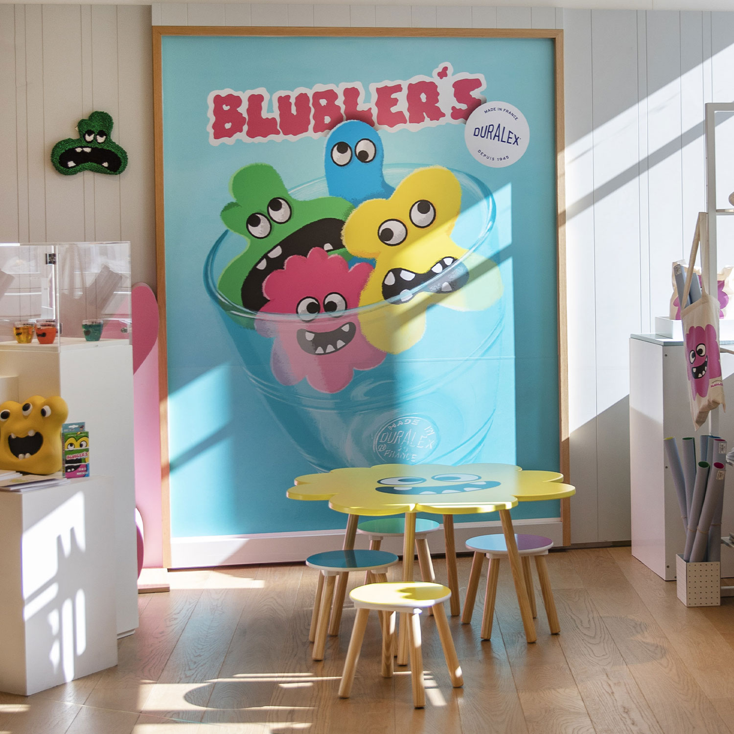 Il était une fois, une potion secrète qui se renversait dans un camion de livraison de chewing-gums, et qui donna subitement naissance à de supers Blublers : les petits héros d’un univers très coloré et surtout très attachant ! Pour l’Exposition X, Blubler’s joue carte sur table et se marie avec l’expert du verre de cantine Duralex. Découvrez une collection surprenante où les petits personnages du jeu se collent à de la vaisselle, des porte-clés ou encore des tee-shirts personnalisables !