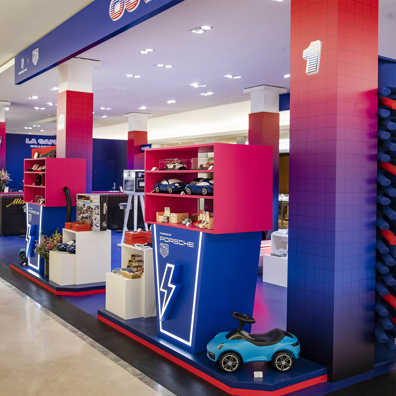 À l’occasion de l’exposition X, Le Bon Marché Rive Gauche revêt les couleurs d’une incroyable station-service pop et décalée où Porsche et TAG Heuer célèbrent leur amitié sincère. La marque allemande de voitures de sport et la manufacture suisse de montres de luxe vous offrent ainsi une expérience immersive autour du luxe, du design et de l’innovation.