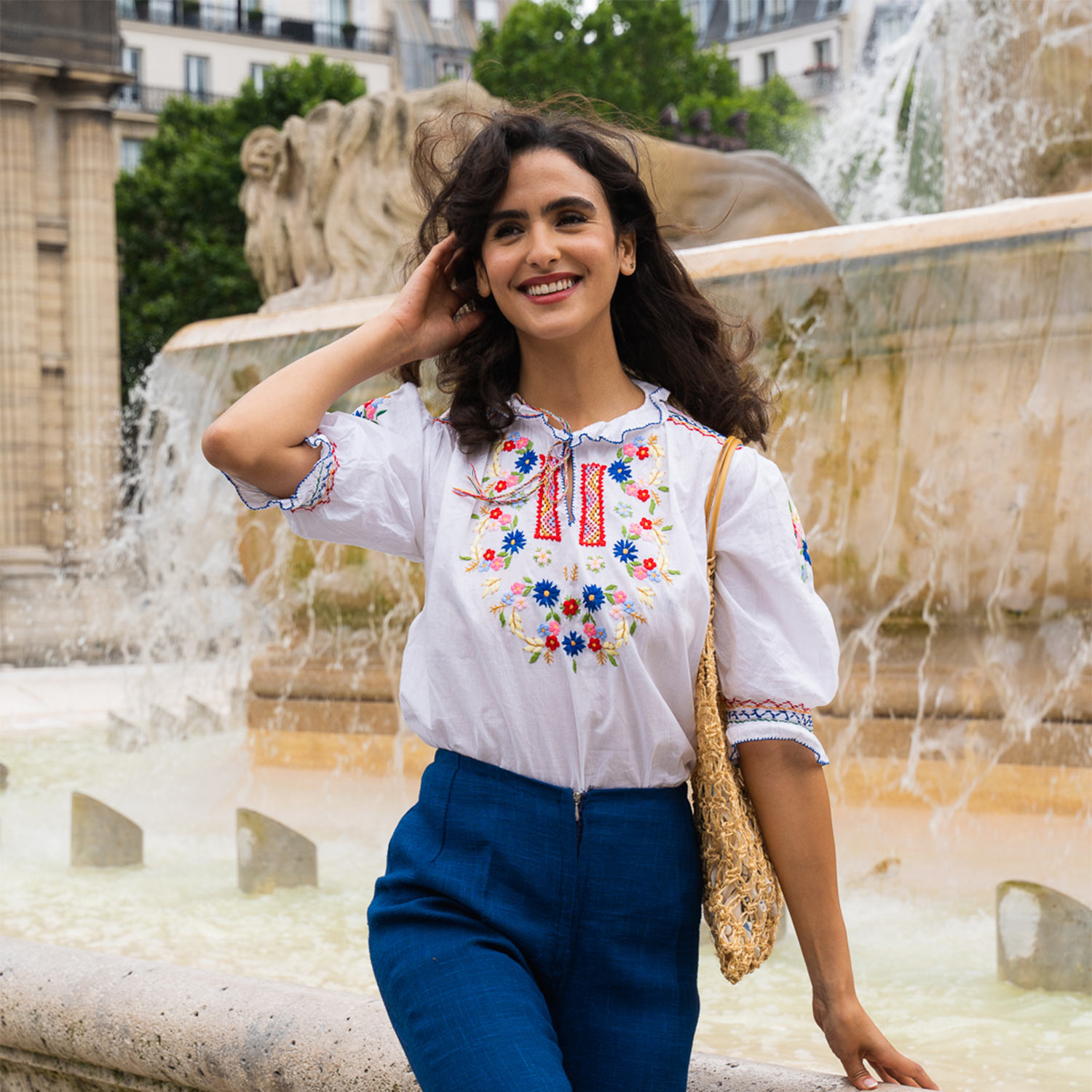 Juny (@Junybreeze) porte une blouse brodée, pantalon et sac Imparfaite Paris.