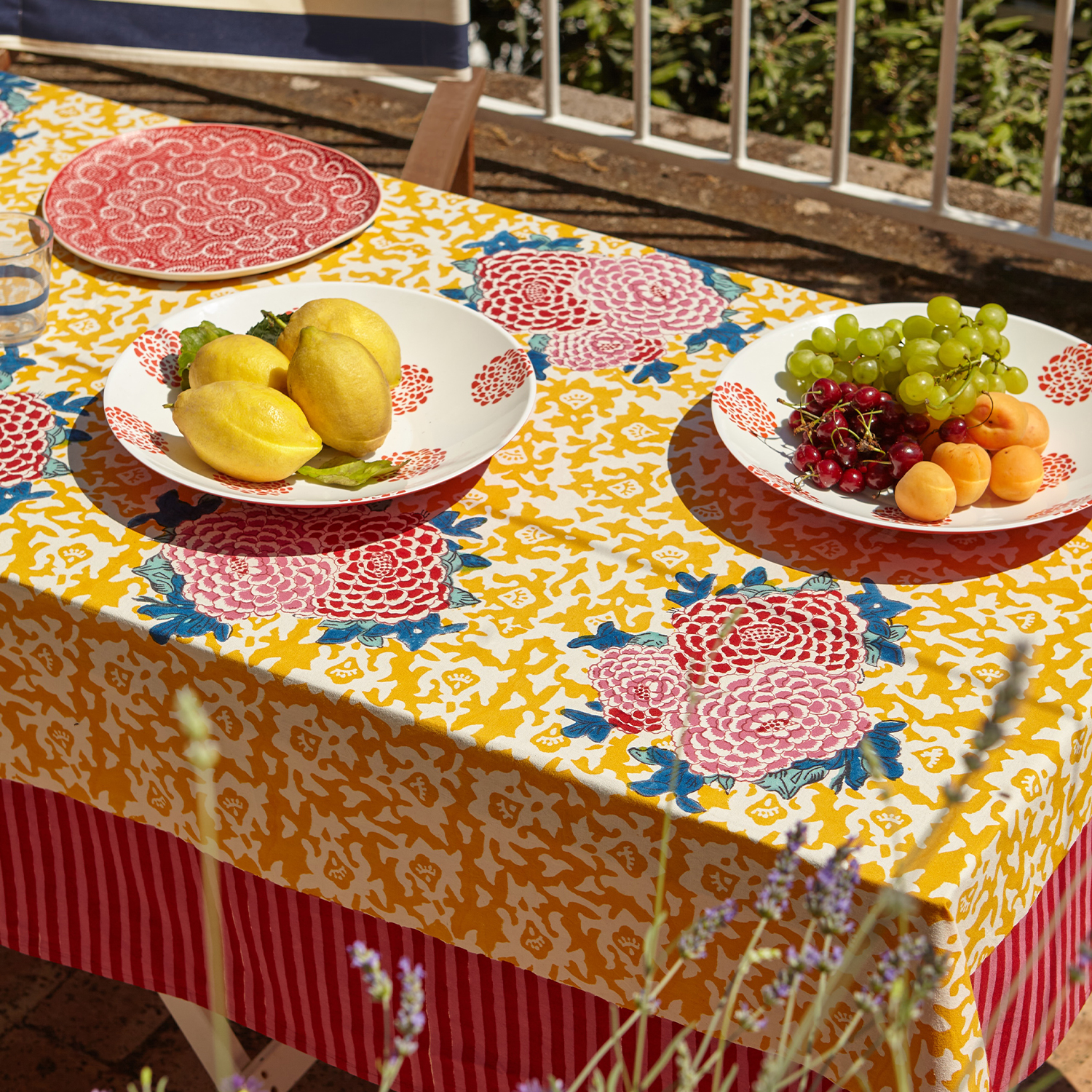Vous sentez ce parfum estival ? Celui qui nous plonge au cœur de l'Italie de Lisa Corti ? À l'occasion des « Bons Marchés de l'Été », la créatrice milanaise nous donne rendez-vous au deuxième étage du Grand Magasin avec une collection entre jeux de couleurs audacieux et motifs chaleureux. Parmi nos coups de cœur, la nappe Arabesqua Corolla Gold Natural. Réalisée au tampon de bois selon la technique ancestrale du block-printing, cette pièce aux motifs symétriques et fleuris devient l'élément de décoration idéal pour tous vos déjeuners d'été.