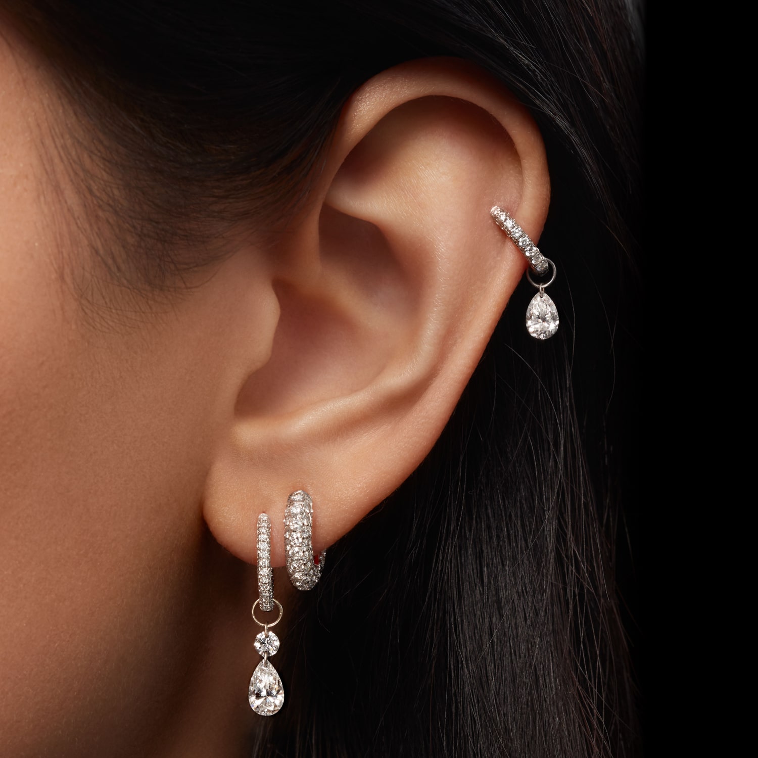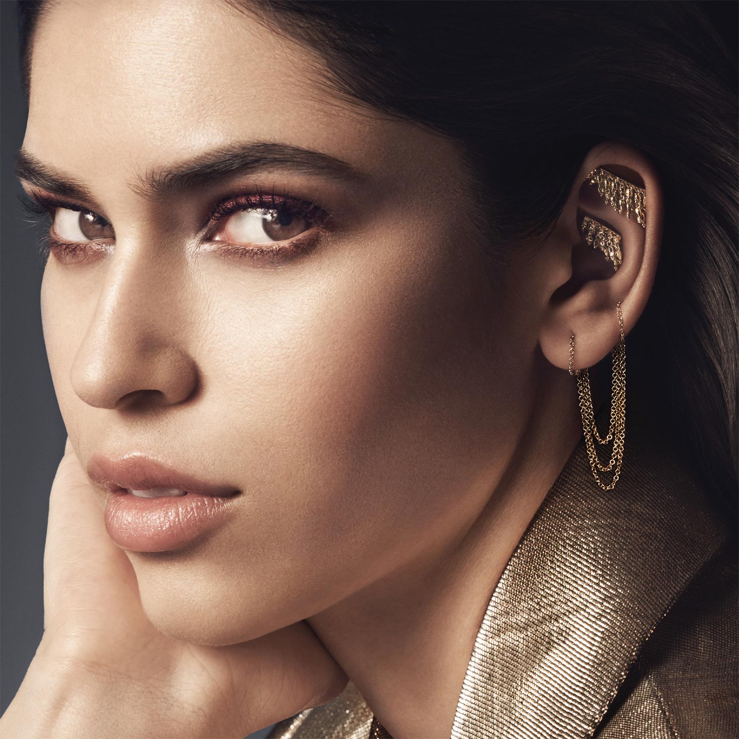 J'aime les anneaux bien ajustés dans des piercings délibérément espacés sur des parties inhabituelles de l'oreille. Parmi les pièces essentielles, je pense aux anneaux d'éternité à diamants sertis invisibles, de forme ronde ou marquise, ou à mes puces charms ornés de diamants, fusion ludique de la puce et du charm. Pour celles qui ne veulent pas de pierres, mes anneaux d'éternité en or à trois pointes restent des classiques.