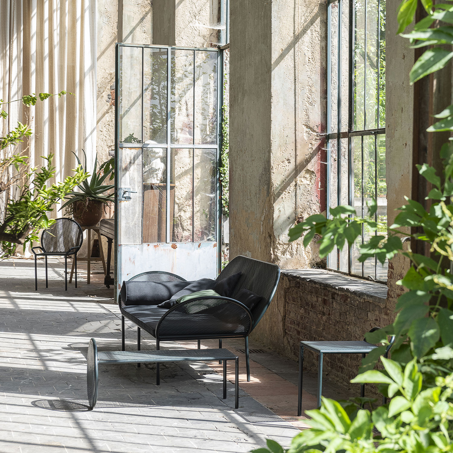 Comment s’évader sans sortir de chez soi ? Le style dedans-dehors vous apporte la meilleure des réponses. Depuis plusieurs saisons, les éditeurs proposent des meubles hybrides conçus pour l’extérieur, mais dont le design recherché en font de parfaites pièces à exhiber dans son salon. La salle à manger accueille des chaises de jardin en fer forgé blanc qui tranchent avec les belles tables en bois de Ferm Living. Les lits de camp se transforment en canapés insolites, agrémentés d’une avalanche de coussins moelleux signés Caravane.