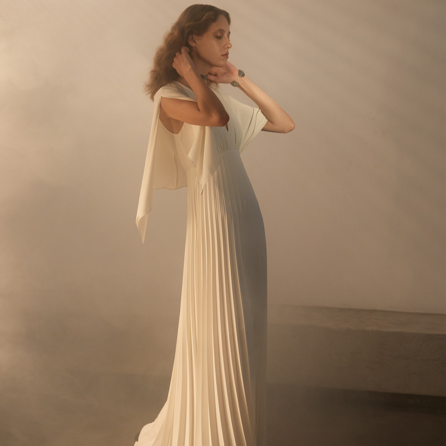 Les pièces de la collection mêlent des lignes aériennes à des jeux de plissés soignés, dans une palette lumineuse. Des touches de cuir et imprimés classiques habillent les accessoires.
