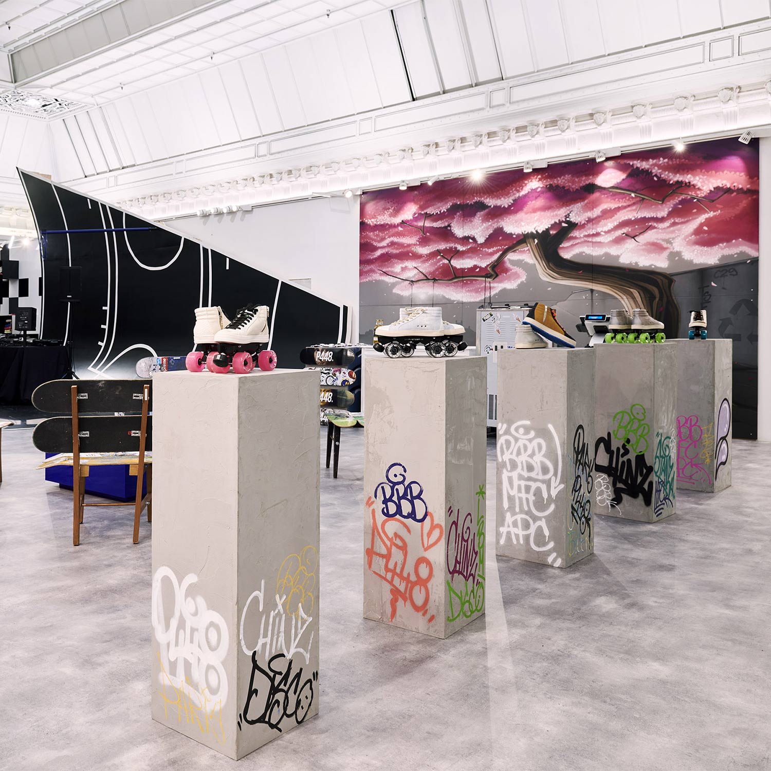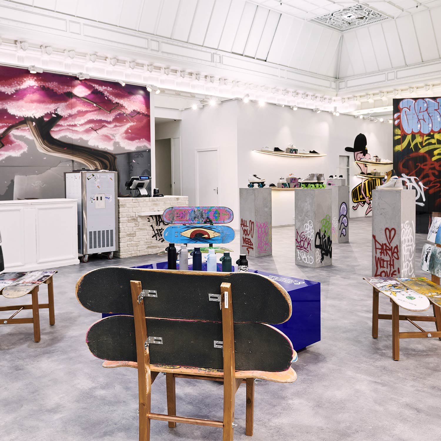 L'info de La Gazette : toutes les pièces de l'espace, y compris les skateboards, les néons et le mobilier sont disponibles à la vente.