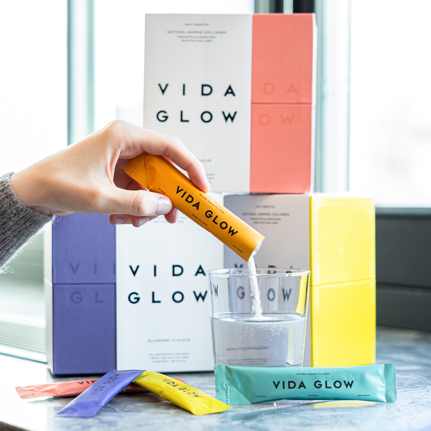 Vida Glow propose des compléments alimentaires à base de collagène marin naturel, issu de peaux de poissons. Leur mission ? Pallier l’évolution normale de notre organisme. À partir de 25 ans, notre corps fabrique moins de collagène, protéine pourtant essentielle à l’élasticité de la peau, à la solidité des ongles et à la vigueur des cheveux. Imaginés sous la forme de poudre à dissoudre dans l’eau, les nutricosmétiques Vida Glow stimulent cette production naturelle. Il suffit de les ingérer et de laisser faire.