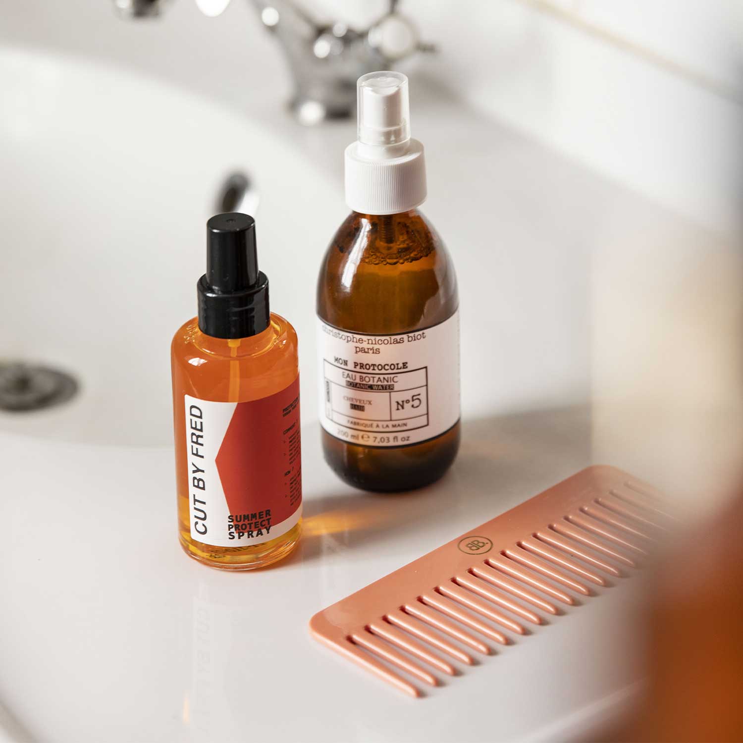 Le bon produit : Le “ Summer Protect Spray “ de Cut by Fred. Un produit responsable — sans filtres chimiques et biodégradable — aux huiles et à la vitamine E, qui défend les cheveux contre les agressions solaires. Vous apprécierez ses notes agréables de citron, de géranium et d’orange.