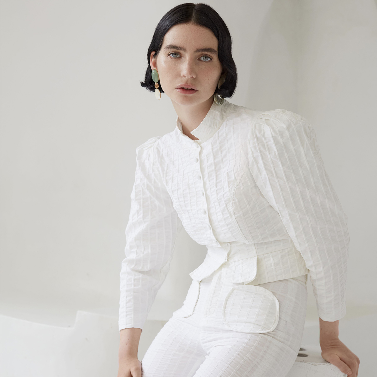 Cet été, faites un pas de côté en troquant votre robe spéciale “occasions festives” pour un tailleur élégant. Destree, la marque fondée par Géraldine Guyot et Laetitia Lumbroso, imagine un modèle déstructuré. Un pantalon à la coupe droite évasée, doté de délicats détails de plis, à porter avec la veste assortie — d’inspiration vintage, soulignée par un col Mao et un boutonnage en ton sur ton. Pour accessoiriser, choisissez optez pour un canotier (modèle Gerhard) et une paire de boucles d’oreilles dorées.