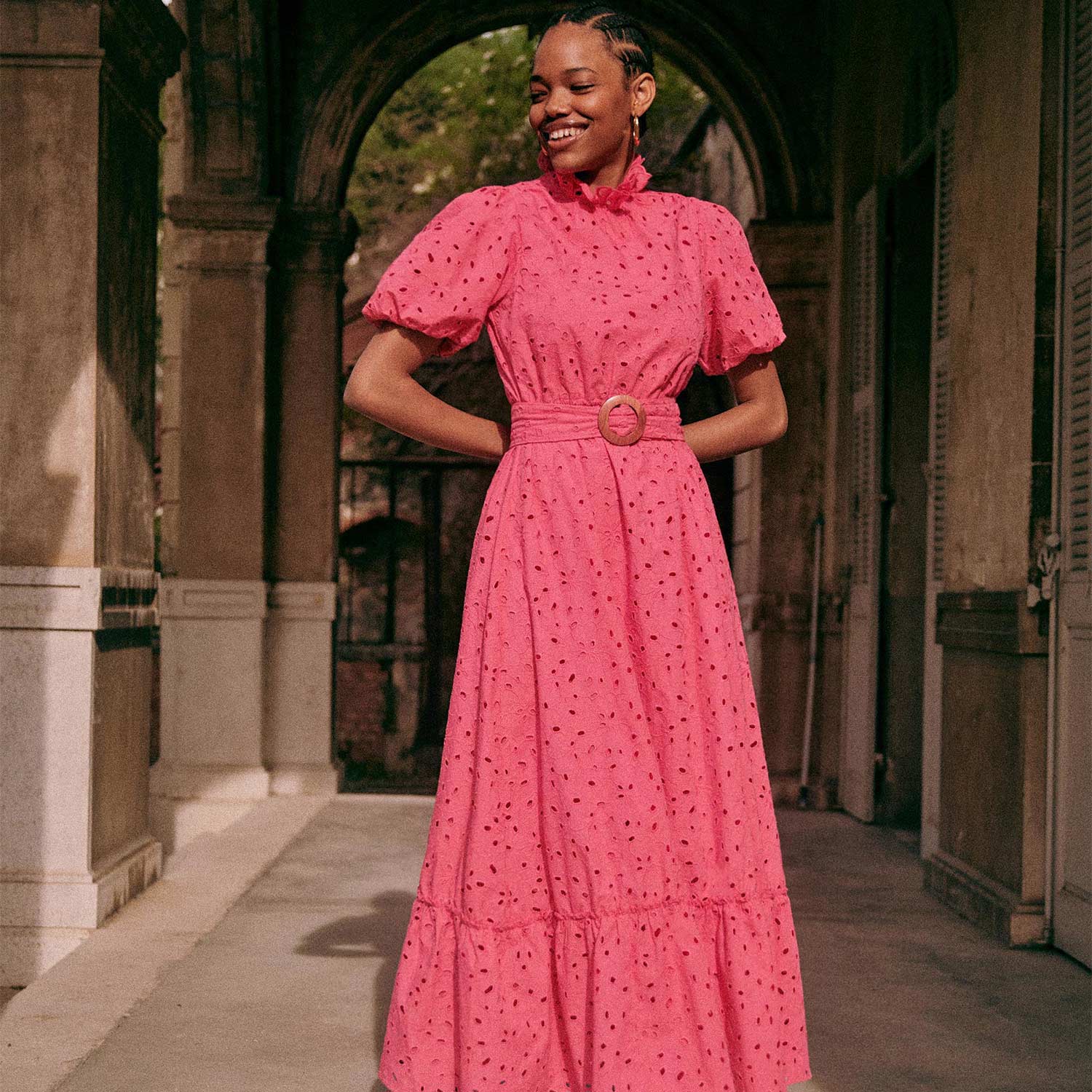 En été vous êtes peut-être tentée d’opter pour du blanc — une couleur qui mettra en valeur votre bonne mine de retour de vacances. Mais d’autres options plus colorées s’offrent à vous. Chez Sézane, les tonalités se font chatoyantes. Vert frais, rose vif ou encore jaune ocre sont autant de teintes que l’on retrouve sur des robes, courtes ou longues.