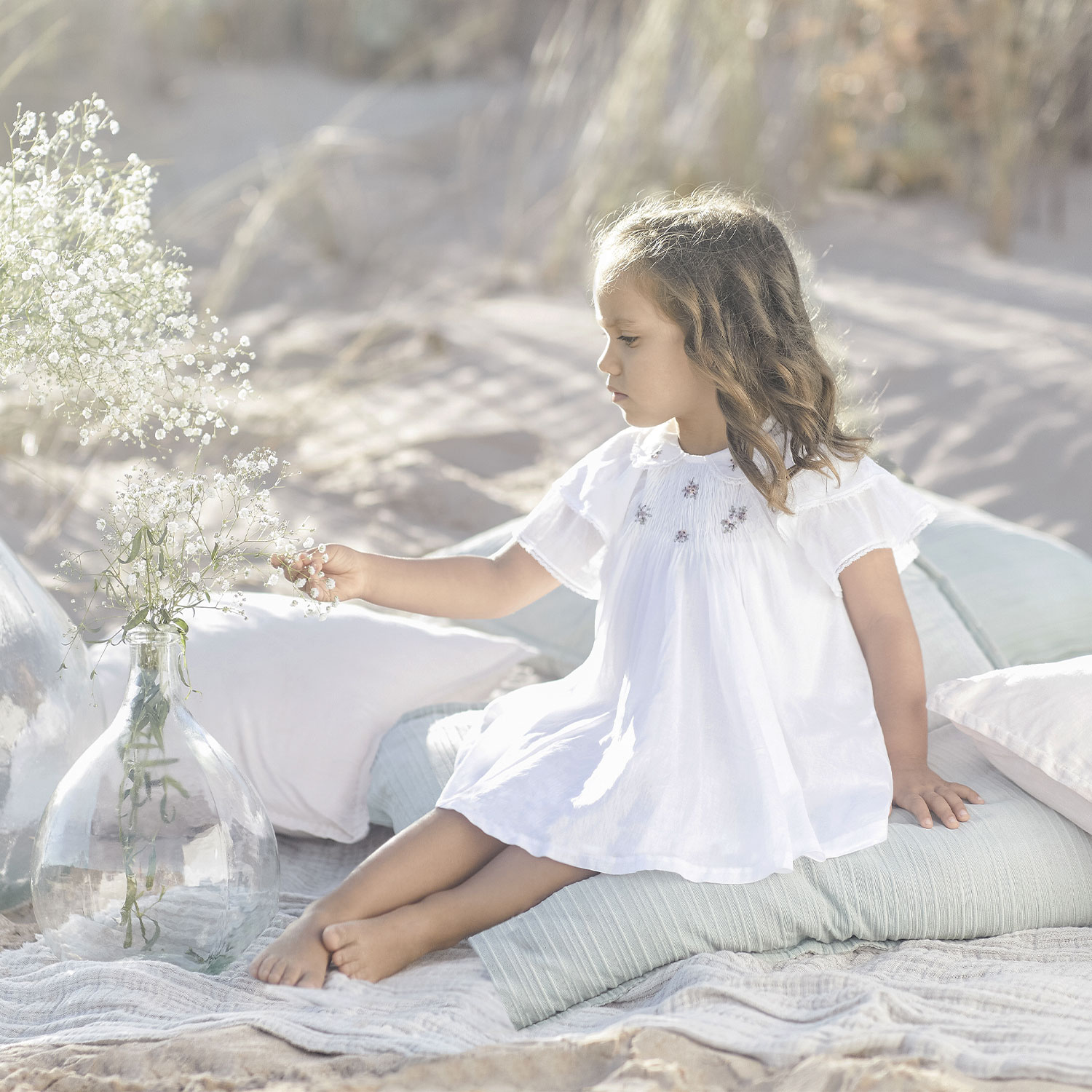Sur les petites robes volantées s’ajoutent de petites fleurs brodées tandis que de jolis boutons lient les bretelles à leur pantalon en lin. Chaque pièce de la collection Cérémonie virevolte dans une atmosphère joyeuse et épurée.