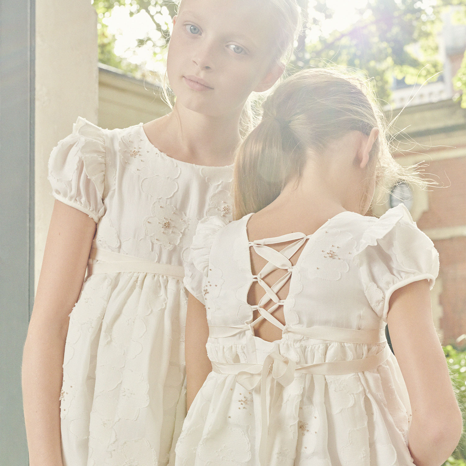 La robe Amber pour fille est adorable avec ses finitions en broderie anglaise autour de l'encolure. Un volant donne de l'ampleur à la coupe et couvre les épaules. À partir de 185€.