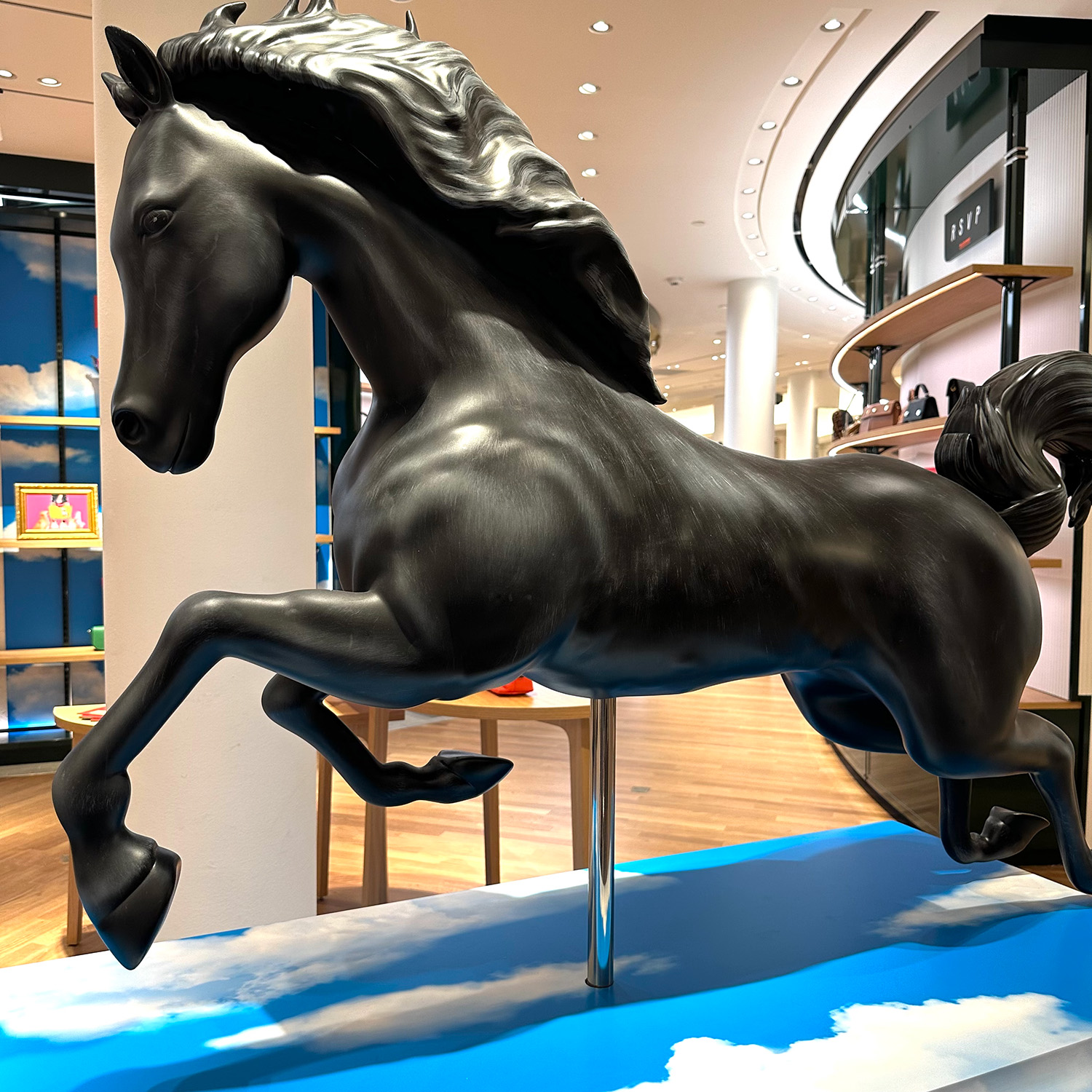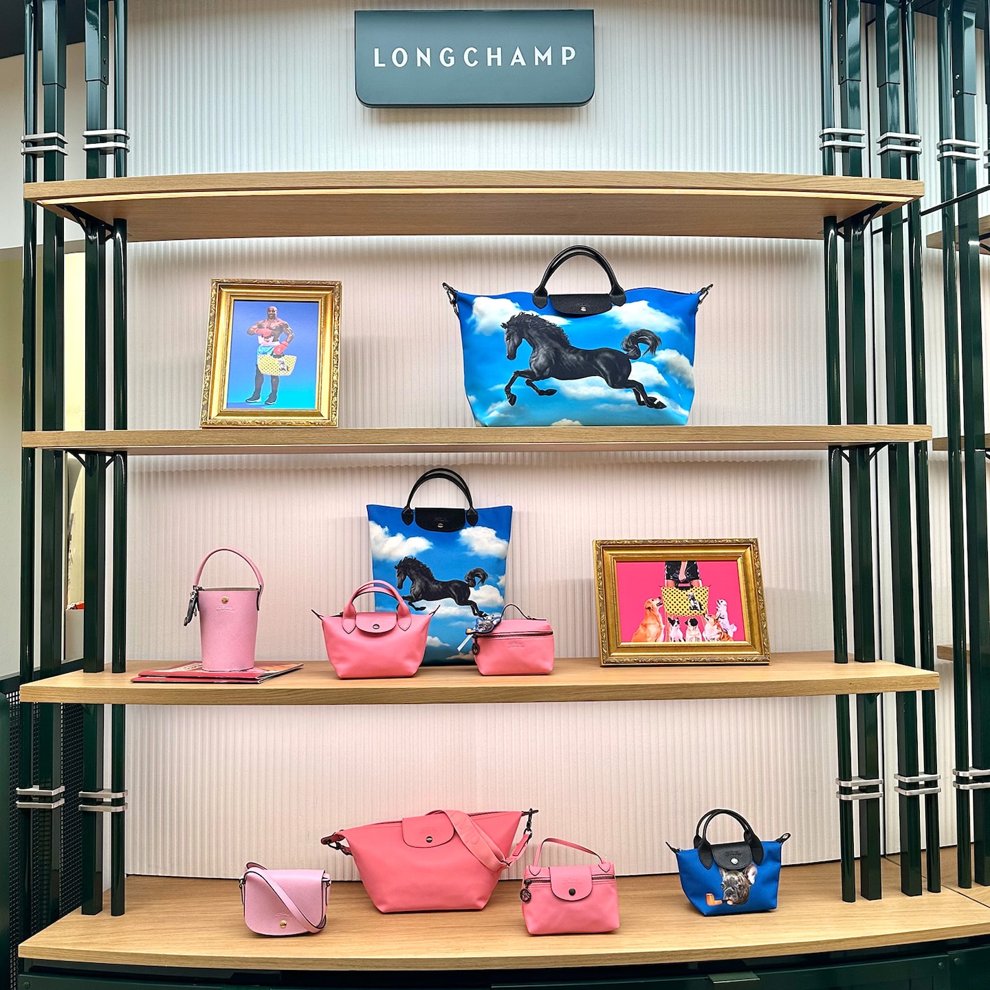 Un cheval au galop, un grand ciel bleu... Non, vous ne rêvez pas, vous êtes bien en plein cœur du Bon Marché Rive Gauche, sur le pop-up onirique et joyeux Longchamp x TOILETPAPER. Pour l'été, la Maison de maroquinerie française s'associe au magazine artistique italien avec une collaboration inédite, qui réinterprète l'iconique sac Le Pliage à travers cinq déclinaisons. Découvrez ces modèles colorés et décalés au rez-de-chaussée, à porter sans modération.