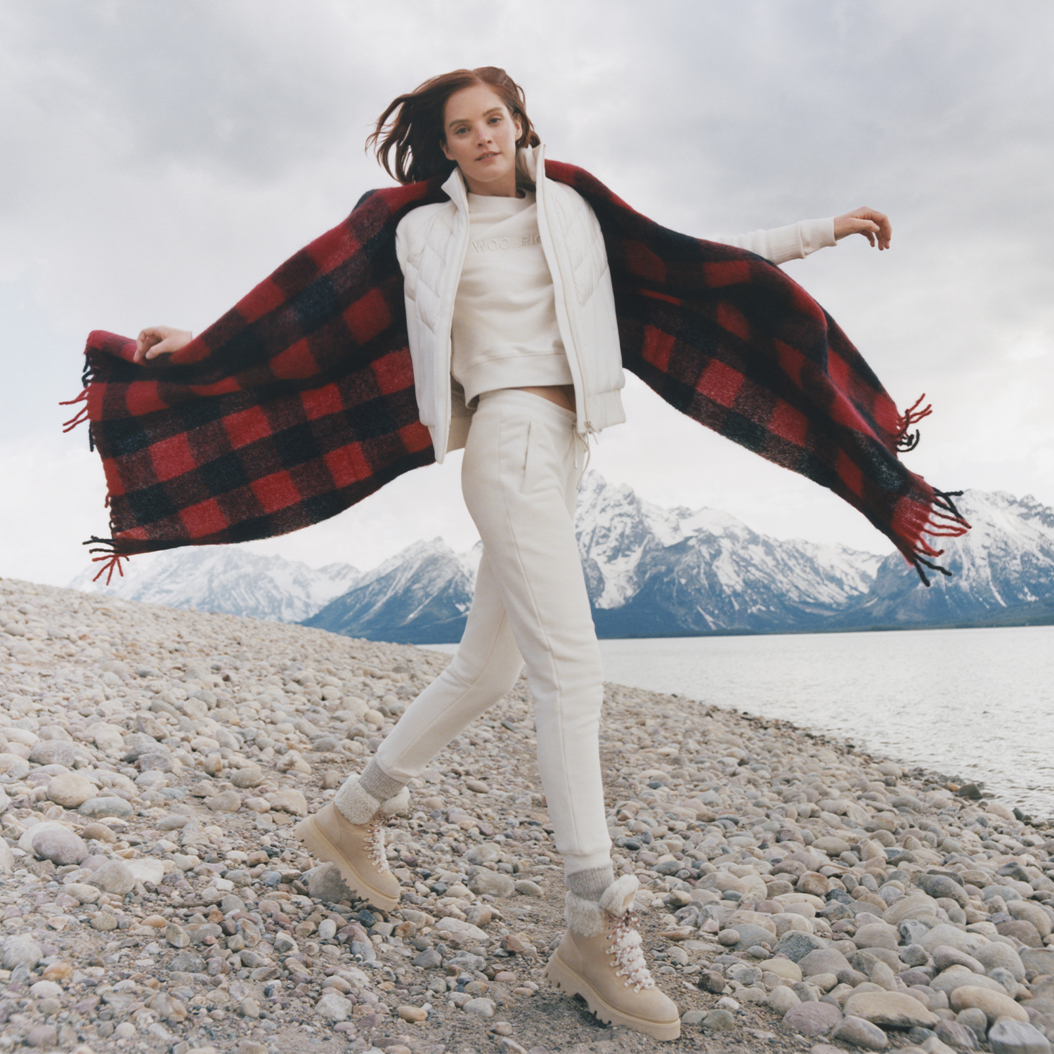 Côté accessoires, direction le pop-up Woolrich au Bon Marché pour (re)découvrir l’emblématique écharpe deux en un de la marque, la Buffalo Check. Cette pièce en alpaga et mohair de la collection « Outdoors » se porte aussi bien en écharpe qu'en cape.